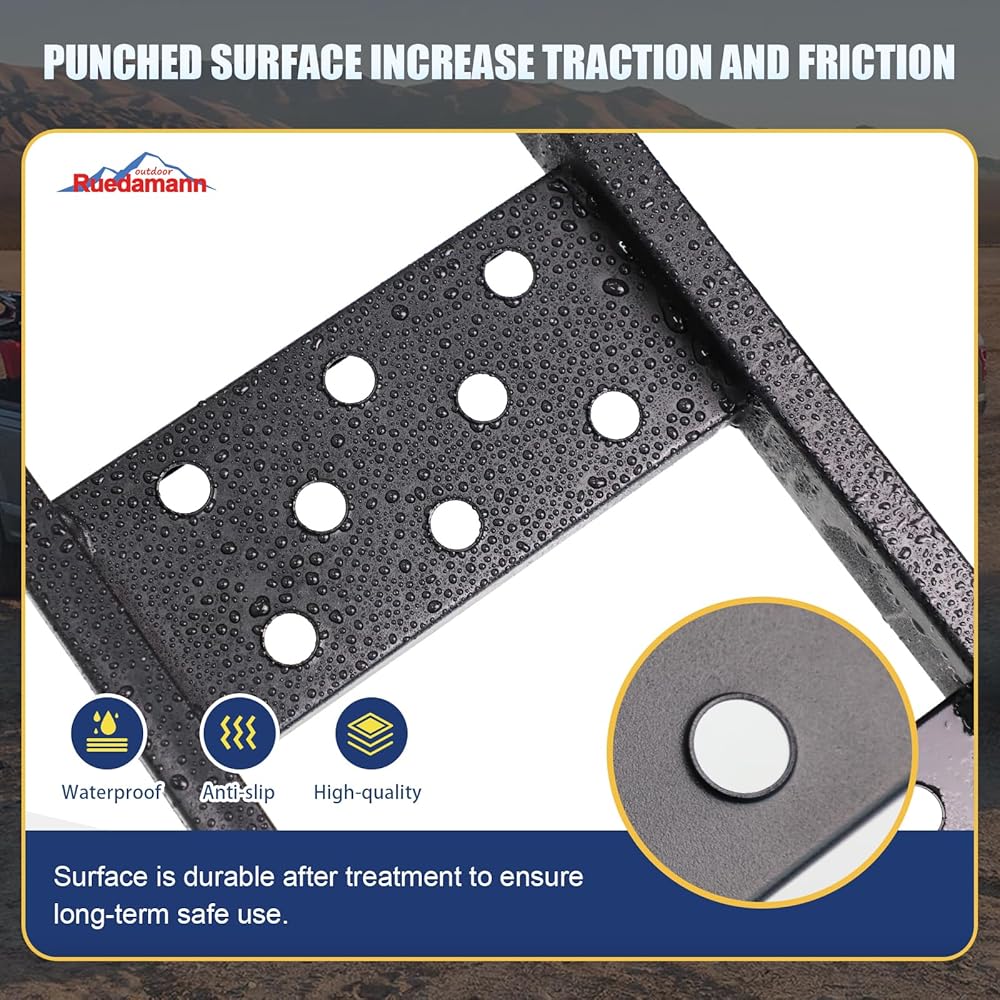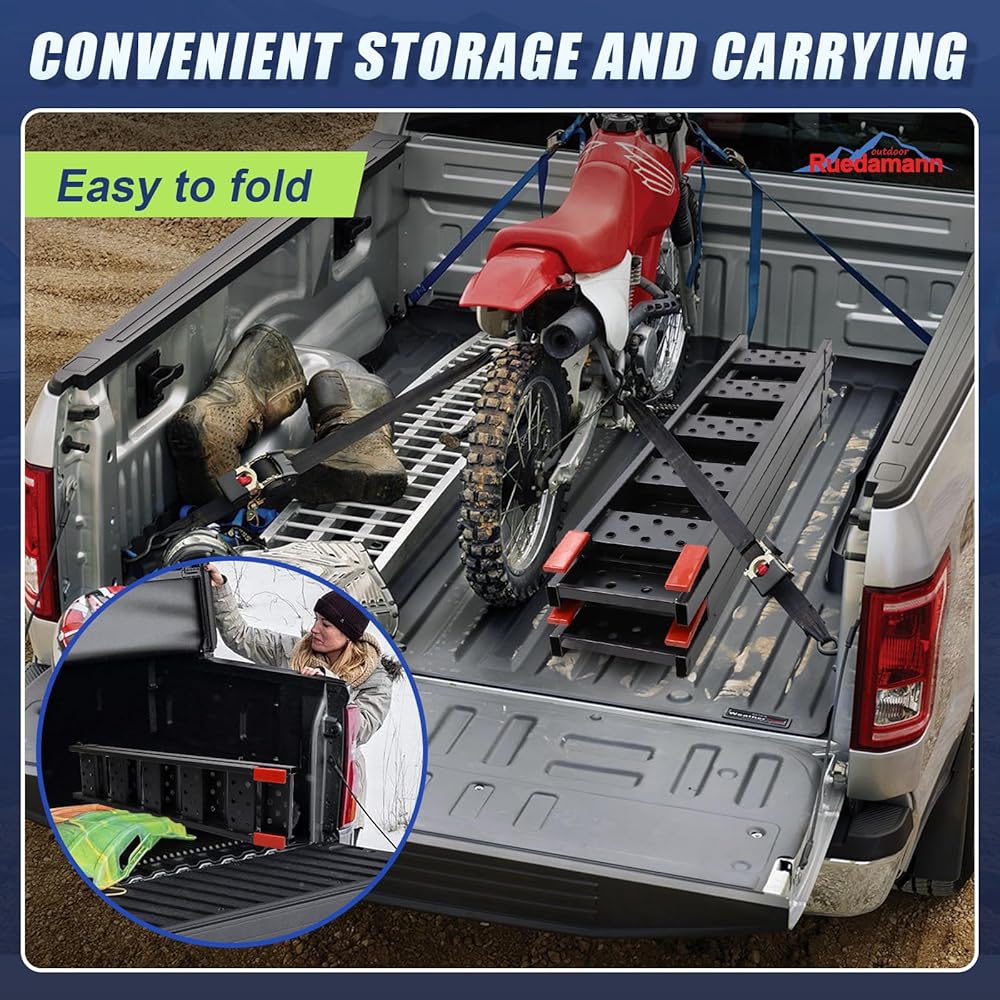 【Upgrade Design】On the surface of steel ramps, we have adopted non-slip holes and hollow design to improve safety, increase friction, prevent equipment tires from slipping and getting stuck, and prevent water accumulation. Rubber tipped fingers provide extra security to your vehicle while also preventing damage to the tailgate. Our hinge is sturdy and durable, allowing the ramp to fold and unfold countless times without any malfunctions.