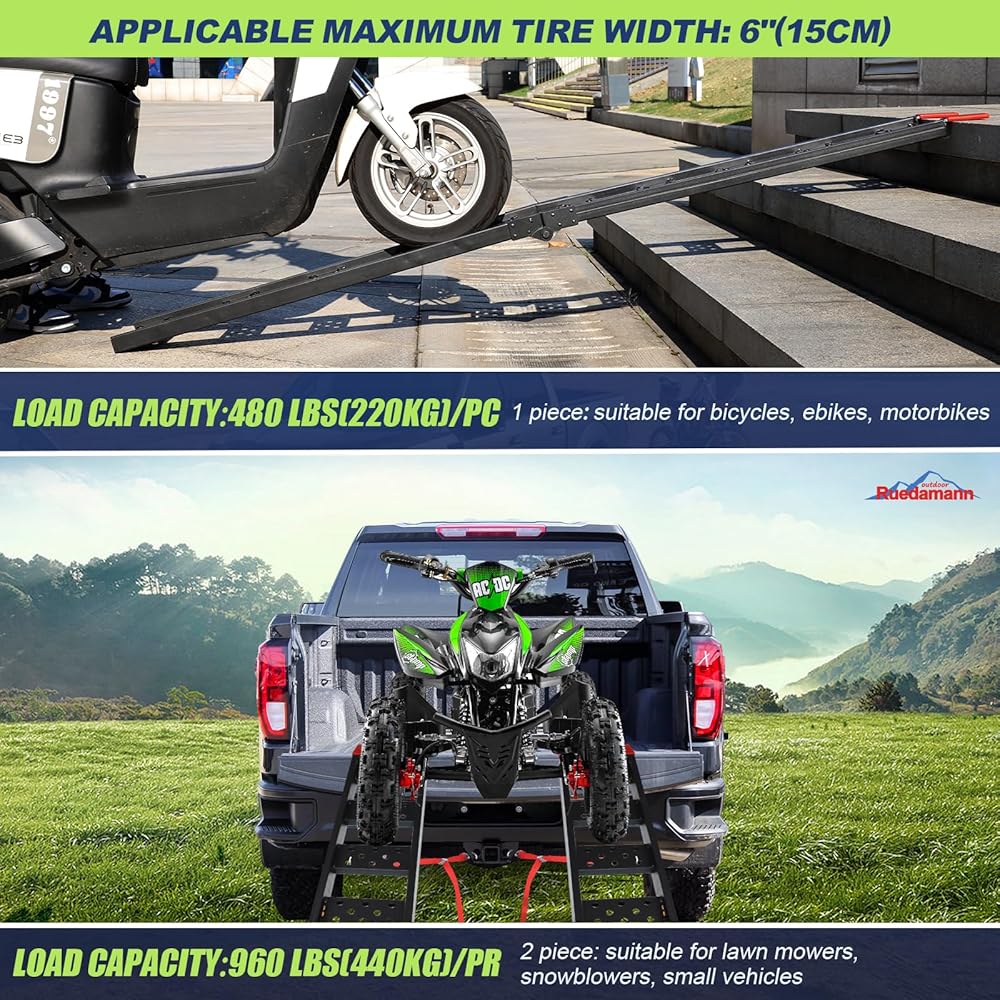 【Sturdy Truck Ramp】Portable ramp is made of heavy-duty alloy steel, not easy to rust, sturdy and durable. The capacity of two pieces is 960LBS, and the capacity of one piece is 480LBS. Before use, please confirm the weight of the machine you will carry, please do not exceed the max capacity.