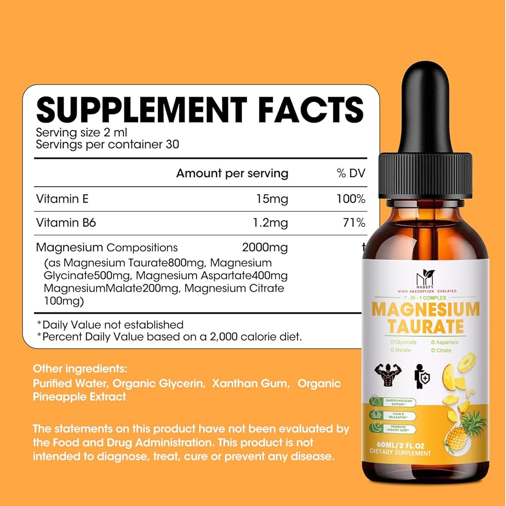 【ADVANCED FORMULA】At MABEFY, we always develop advanced, effective formulas.Our new Magnesium Complex supplement, featuring 2000 mg of Chelated Magnesium as 5 superior magnesium forms—Magnesium Taurate 800mg, Magnesium Glycinate 500mg, Aspartate 400mg, Malate 200mg, and Citrate 100mg. It's crafted to support heart health and blood circulation and fortified with Vitamin B6 & E for maximum potency.
