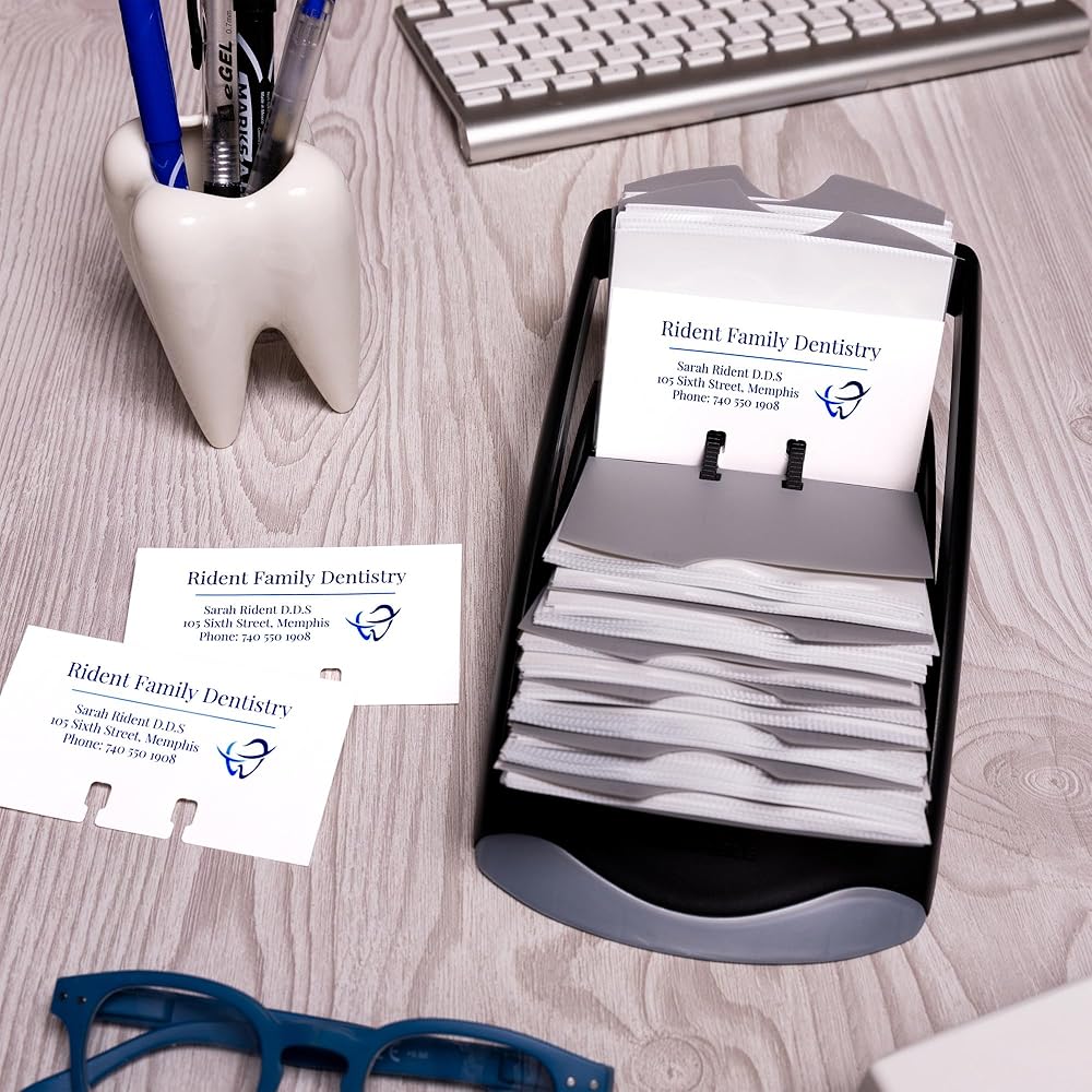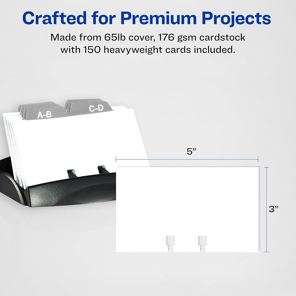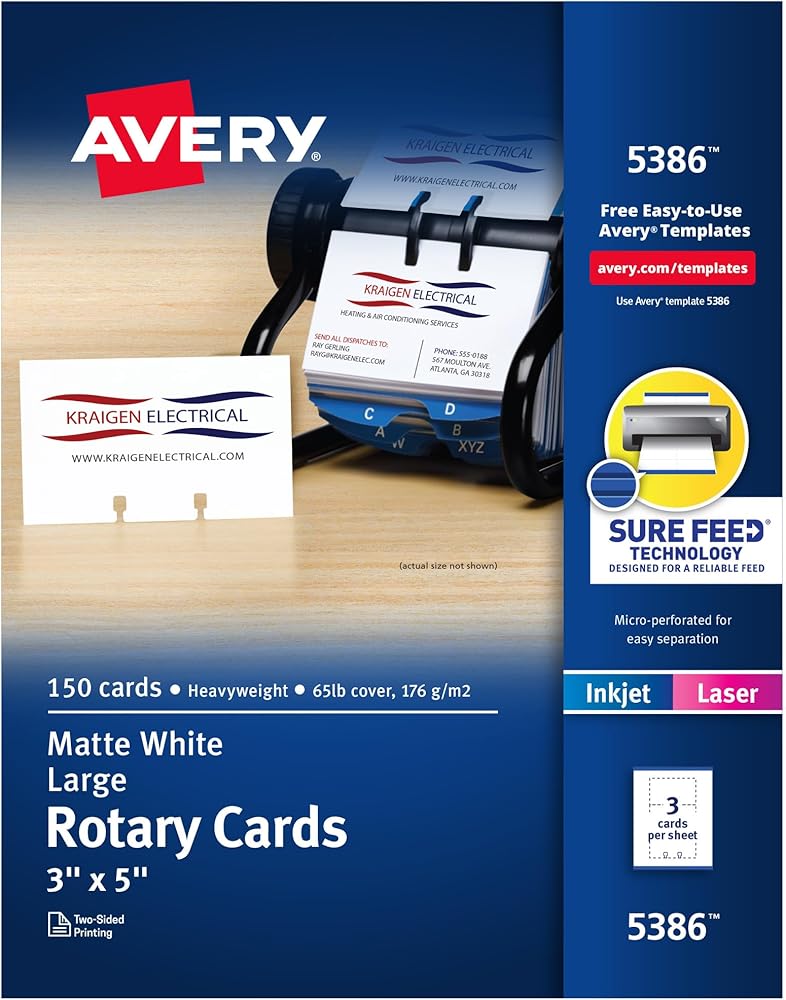 With addresses, phone numbers and e-mails mounting on your desk, contact information can get lost in the shuffle. This 150 pack of Avery 05386 customizable rotary cards can help you organize and manage your contacts more efficiently and is perfect for your Rolodex or other rotary card device. Cut from quality cardstock with a weight of 65 lbs / 176 gsm, these bright white premium 3" x 5" index cards immediately feel different from everyday card sheets. Proprietary Avery Sure Feed technology helps deliver a more reliable feed through your printer in order to minimize print misalignments and paper jams. Both sides of the blank index cards for rotary devices are optimized for laser and inkjet printers to let you create stunning double-sided designs. Explore a variety of templates, tools and designs to create your own unique contact cards or recipe index cards when using Avery Design and Print Online. Convenient do-it-yourself rotary cards mean that you can make changes and print new cards at a moment's notice.