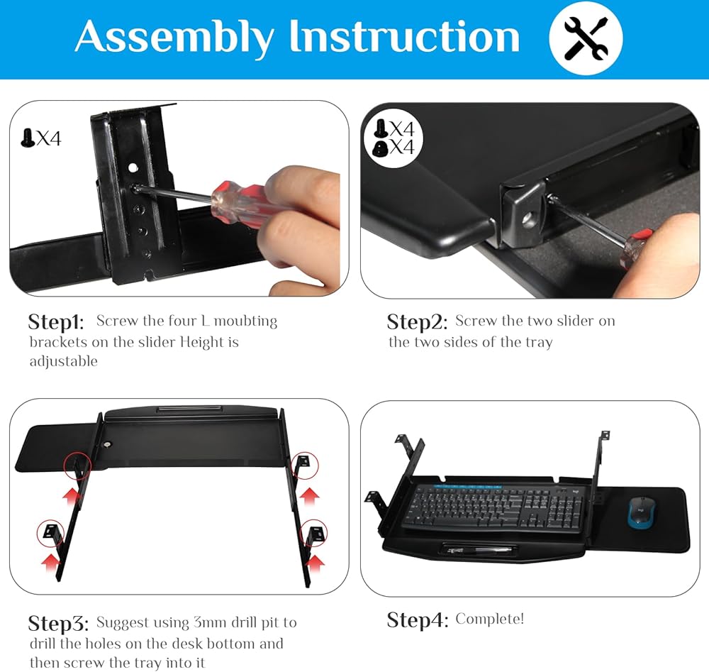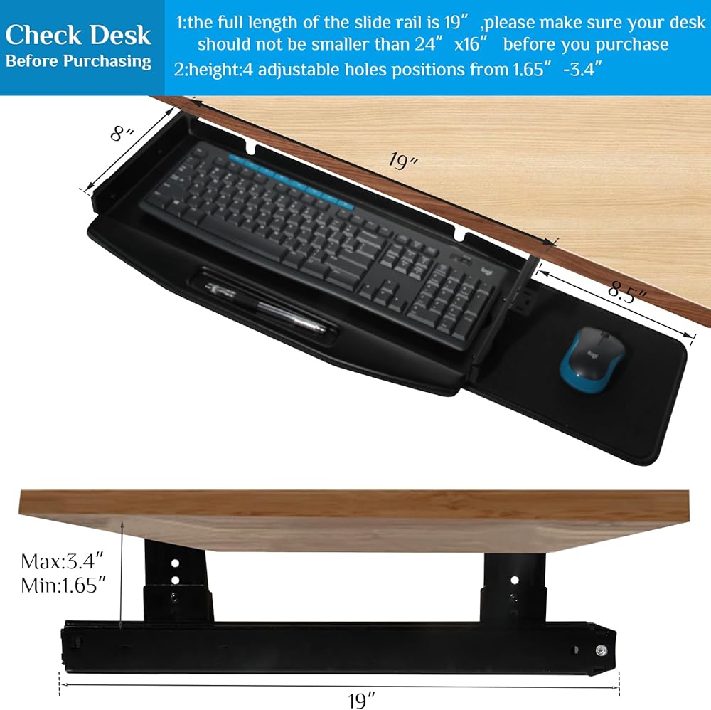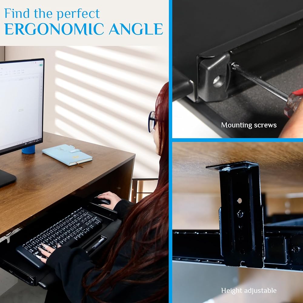 Space-Saving Solution: Utilize the under desk mounted keyboard holder to free up valuable desk space, perfect for those seeking a "keyboard drawer under desk slide" option.