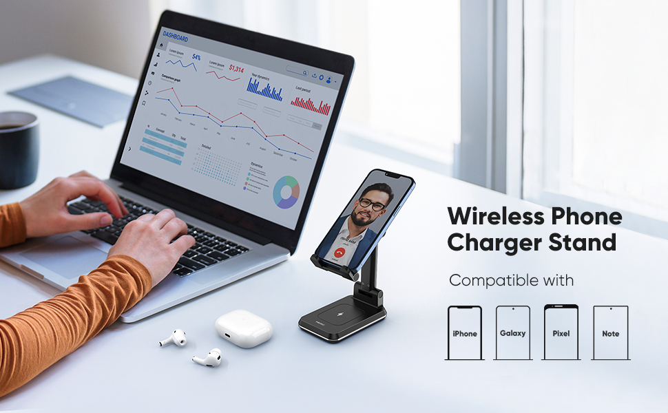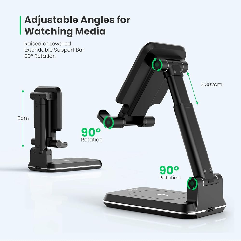 ADJUSTABLE HEIGHT & ANGLES: Our wireless phone charger stand features an adjustable design that allows you to easily adjust the height of the stand and the angle of the holder making it perfect for watching a movie, facetime, working and much more!