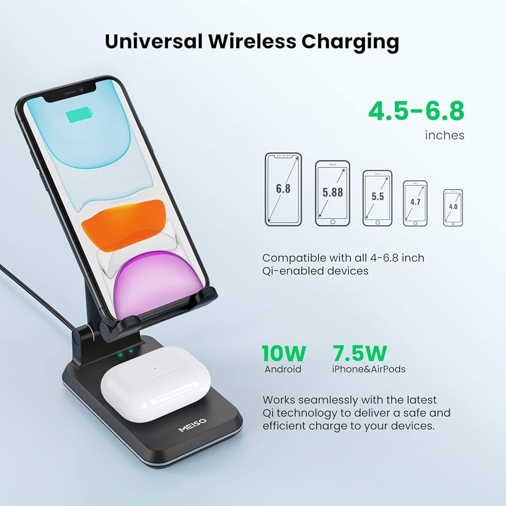 WIDE COMPATIBILITY: The wireless charging station is compatible Samsung Galaxy Note10/ Note 10+/S20/S10/S10E/S10+/S9,iPhone12/12 Pro/12 Pro Max/11 /11 Pro/11 Pro Max/XS/MAX/XR, Airpods/Airpods Pro and a wide variety of other smartphones including LG, Nexus, Sony Xperia and more to deliver fast charging. Kindly note: Please extend the bottom feet of the upper charger entirely when you use a big size phone like iPhone 12 Pro max or Samsung Note 20+ etc.