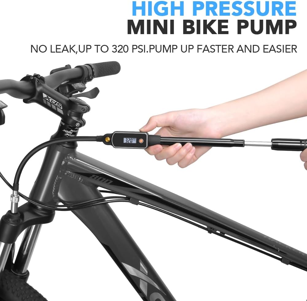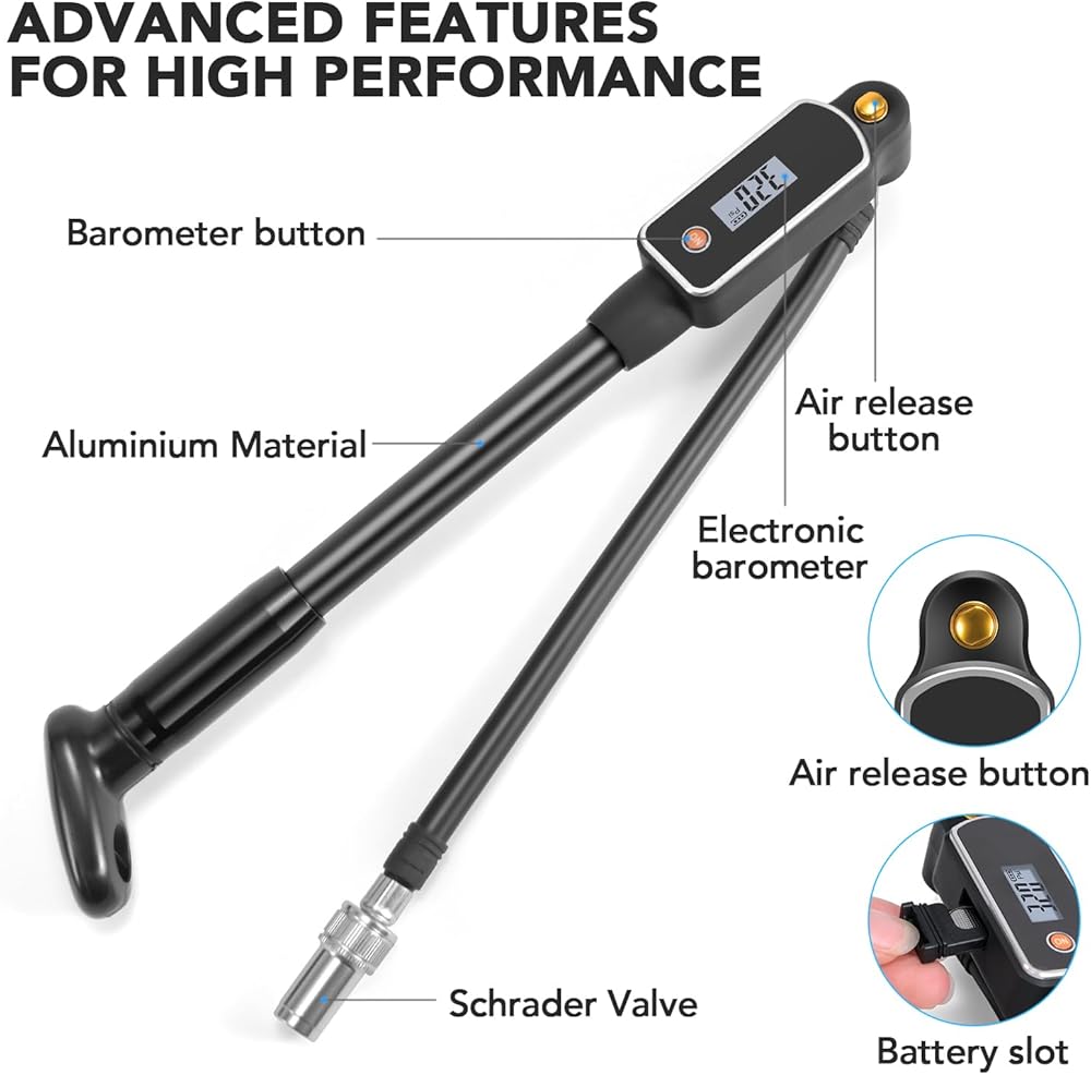 Accurate Digital Pressure Gauge: The digital bike shock pump gives you precise pressure measurement. More accurate than ordinary pressure gauge pumps. Up to 320PSI pressure, clear high-tech LCD display panel.