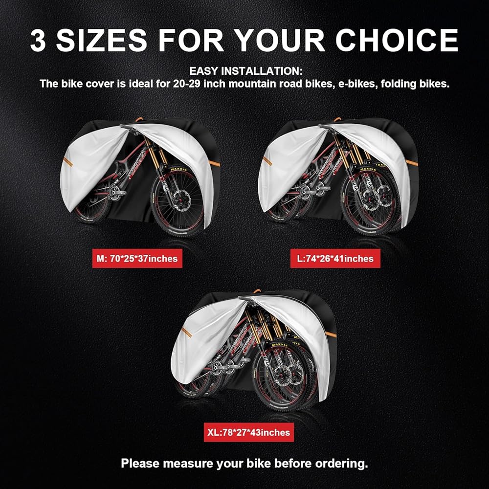 Make sure the cover fits almost most mountain bikes, e-bikes and city bikes with wheel sizes up to 29 inches. It even fits scooters and some motorcycles.