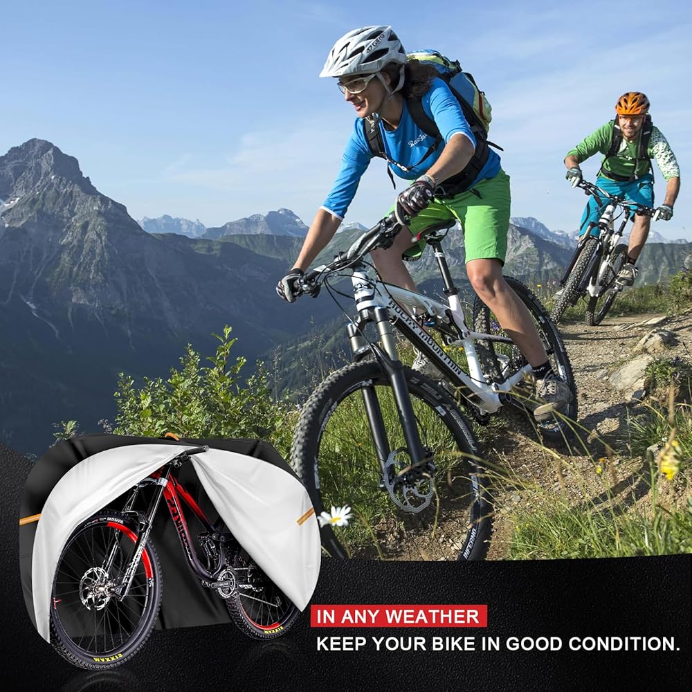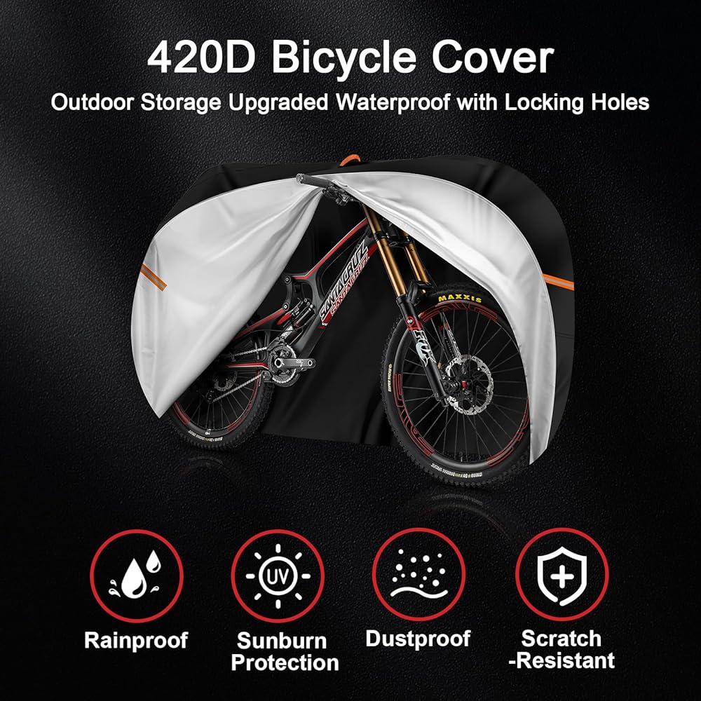 TOP RESISTANT RAIN PROTECTION: Our bike cover is made of 420D waterproof oxford fabric with PU+UV coating, which is resistant to rain, snow, dust, and bird droppings, ensuring that your bike stays in good condition no matter what the weather throws at it.