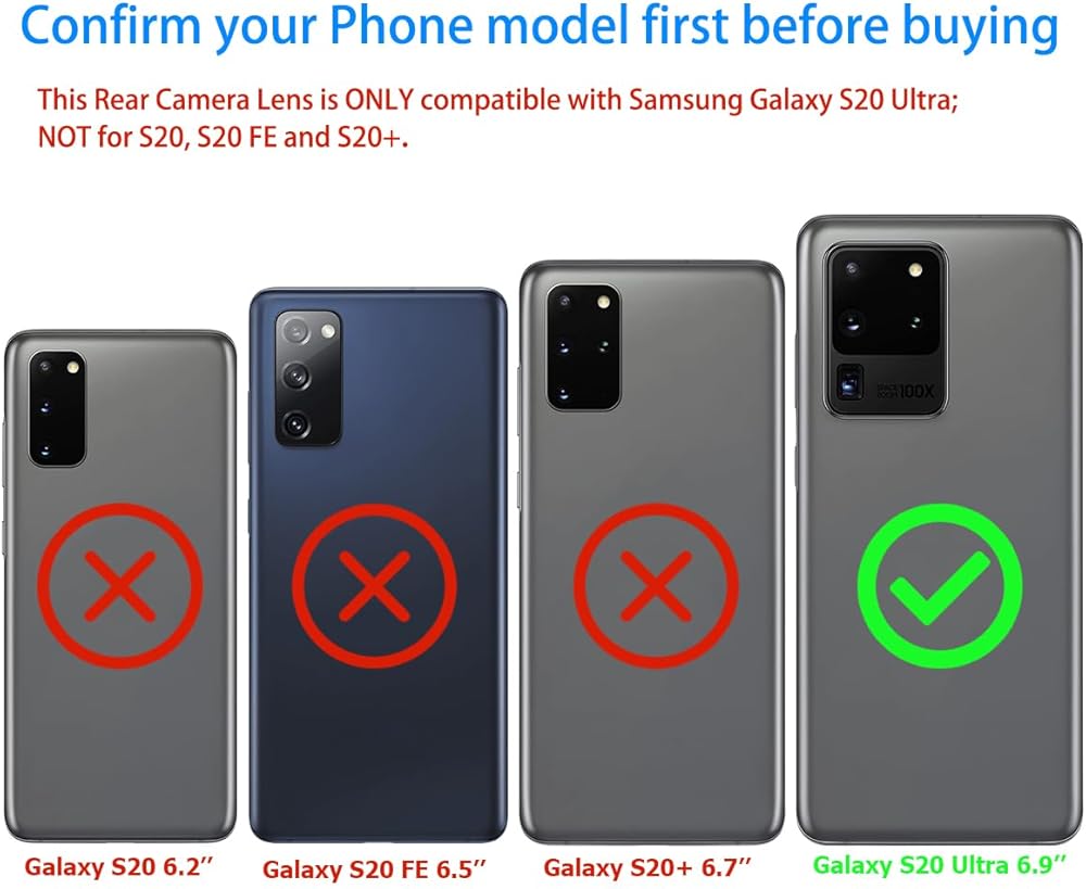 【OEM Camera Lens Glass 100% Fit】100% perfect fit original back rear camera glass replacement for Samsung Galaxy S20 Ultra. Precisely the same as your original camera glass. Tested one by one by professional technicists before shipping. No problem with focusing.