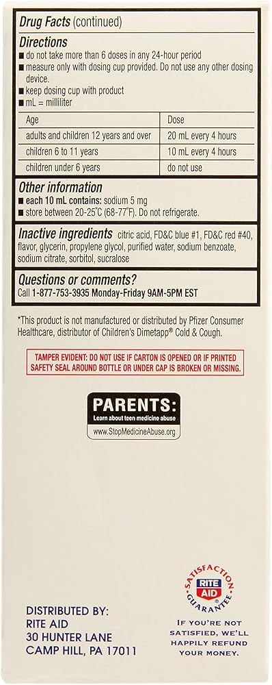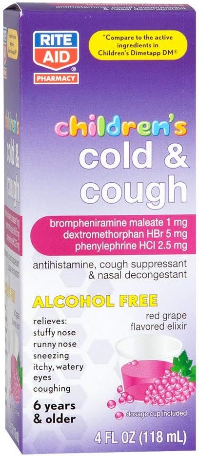 There's nothing is worse than seeing your little one struggling with cold and cough symptoms. Get them the relief they need with Rite Aid Children's Cold & Cough Syrup. This combination of antihistamine, cough suppressant, and nasal decongestant is alcohol-free and quickly and effectively relieves symptoms of cough, itchy, watery eyes, runny nose, sneezing, stuffy nose and itching of the throat or nose. The great-tasting grape flavor helps the medicine go down so your child can get back to feeling their best. At Rite Aid, we have a personal interest in your health and wellness. That's why we deliver the products and services that you, our valued customer, need to lead a healthier, happier life. Everyone at Rite Aid, from our knowledgeable, caring associates and pharmacists to the members of our board of directors, works together to provide you with a superior pharmacy experience. Rite Aid is proud to be one of the nation's leading drugstore chains. We are caring neighbors, involved in community activities in meaningful ways, and committed to reflecting the diversity of each community we serve.