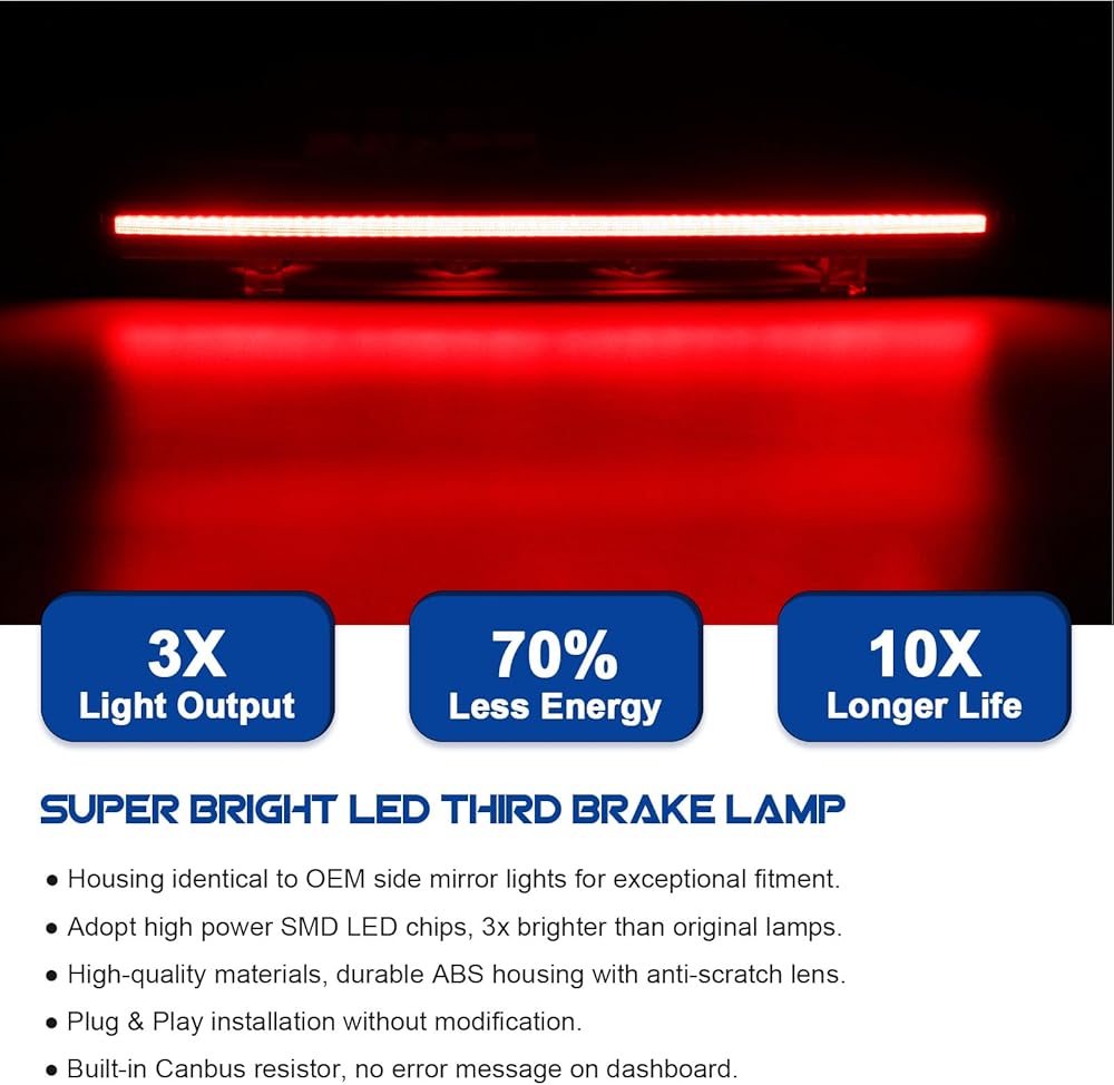 【Easy to Install】Plug & play, no modification needed,Completed the installation in 10 minutes. just unplug the old 3rd brake light and insert the new automotive LED 3rd brake light.