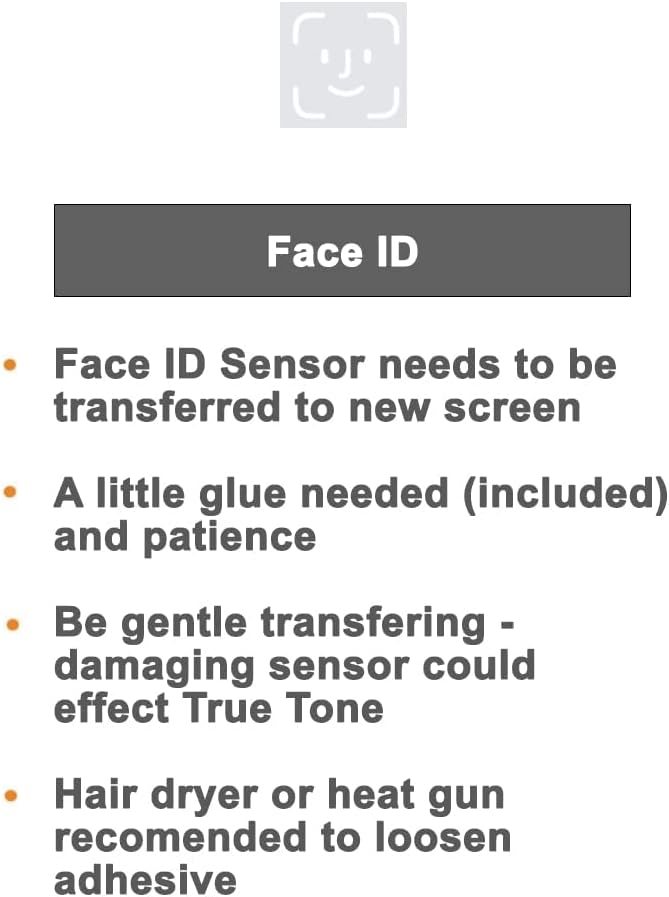 [NOTE] You can't replace just the glass without specialized equipment and expertise. The LCD and Glass Touch are fused together. Our kit is suitable for a DIY repair. BE WARY of glass only kits. [NOTE] Face ID sensor cable needs to be transferred from original to new screen. Damaging sensor could effect True Tone.