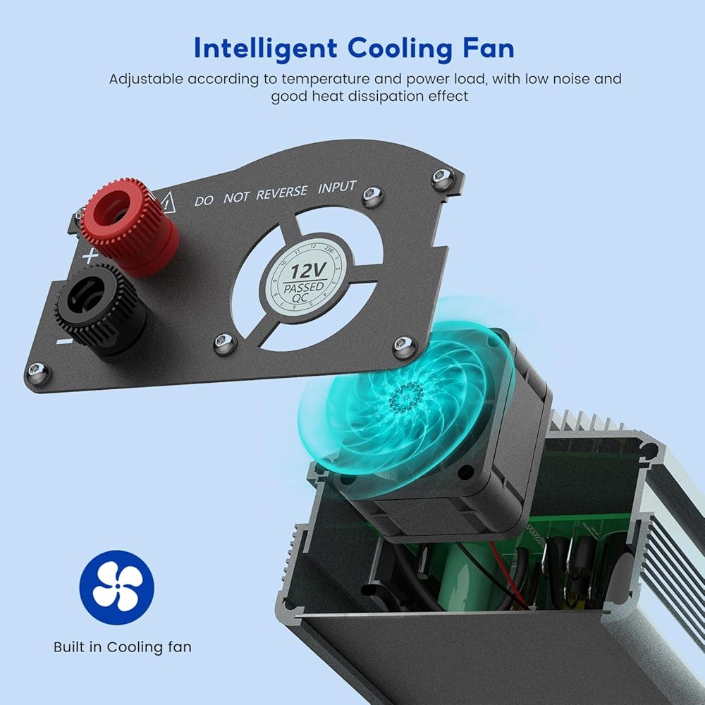 【High quality materials】Durable metal housing provides advanced protection from drops and bumps. Integrated very silent cooling fan helps reduce heat and prevents short-circuit.When the inverter temperature reaches 45 degrees, the fan automatically begins to dissipate heat.