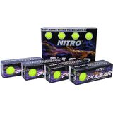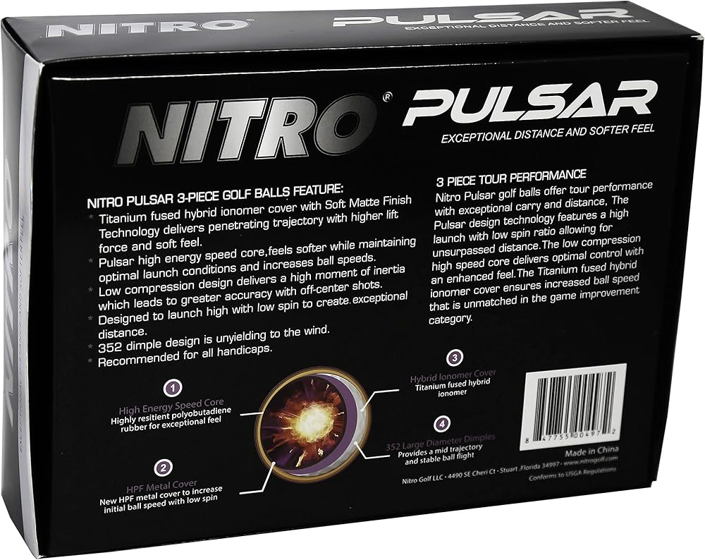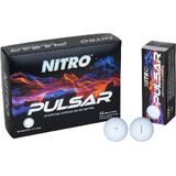 The Nitro Pulsar 3-Piece golf balls feature exceptional distance and softer feel. The titanium fused hybrid Ionomer cover delivers penetrating trajectory with higher lift force. The Pulsar high energy speed core, feels softer while maintaining optimal launch conditions and increases ball speeds. Low 90 compression design delivers a high moment of inertia which leads to greater accuracy with off-center shots. Designed to launch high with low spin to create exceptional distance. 352 dimple design is unyielding to the wind. Recommended for all handicaps. New flat matte finish.