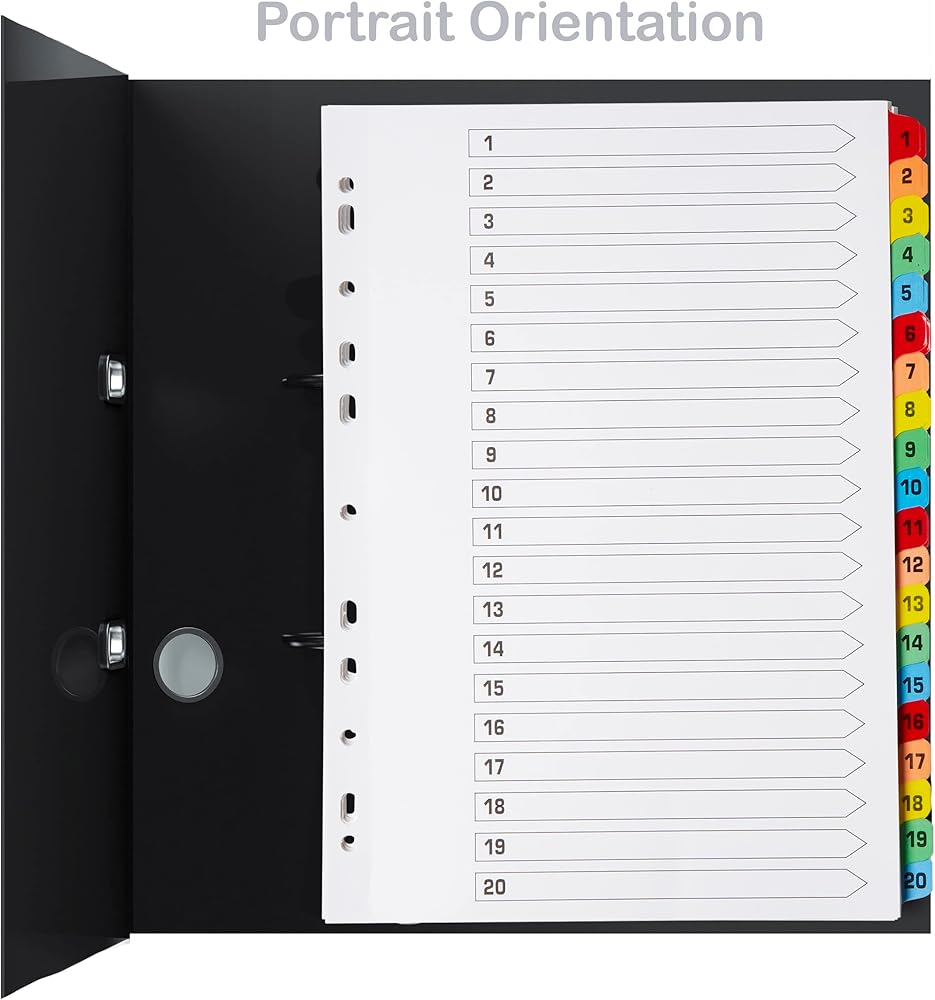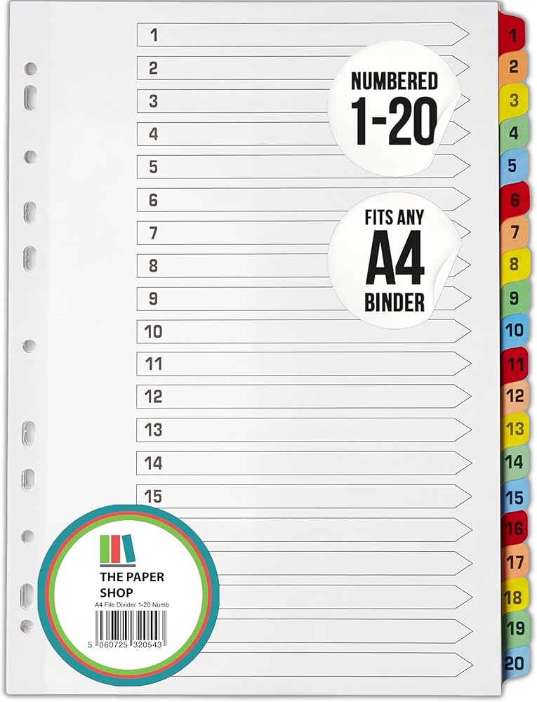 Binder Dividers with Tabs 1-20 Numbered – A4 (1 Pack) | Dividers for 3 Ring Binder | Numbered Tab Dividers for Office, School & Home Organization - The Paper Shop