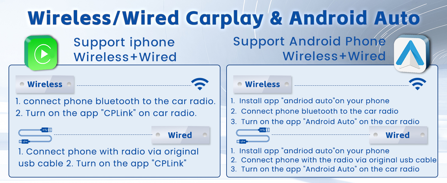 【Wired & Wireless Carplay & Android Auto & Mirror Link】 for Jeep Compass radio is fully compatible with both Apple CarPlay and Android Auto, allowing seamless integration with a range of devices. You can connect to this touchscreen car stereo via Bluetooth or a wired USB connection, providing easy access to all your phone's functions on the large screen. And apps can be cast to the large screen by using Mirror Link.