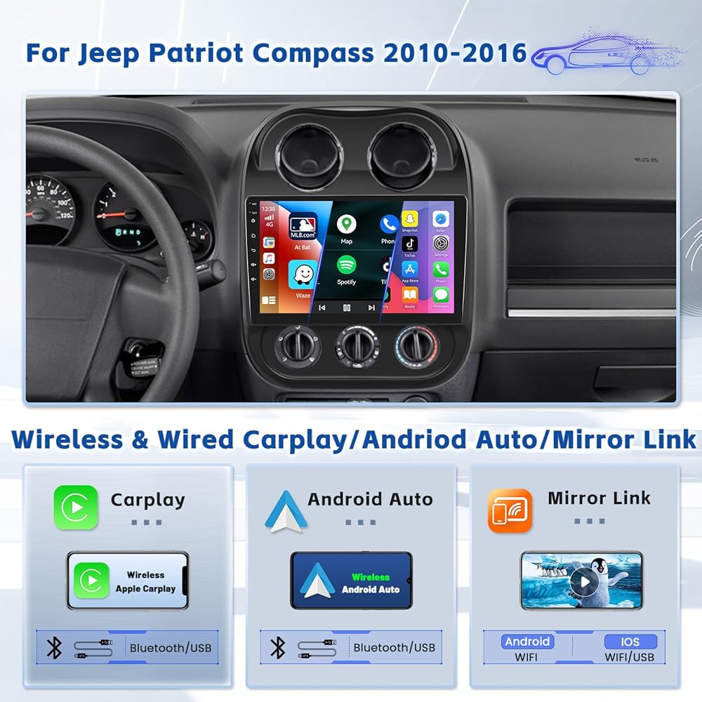[8-Core 4+64G] Android 15 Car Stereo for Jeep Compass Patriot 2010-2016, 10.1'' Touch Screen Car Radio Wireless CarPlay Android Auto GPS 5G WiFi DSP/FM/RDS Mirror Link Bluetooth SWC Backup Cam+MIC