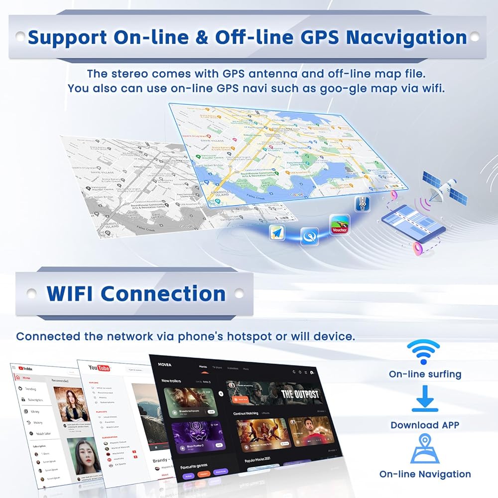 【GPS Navigation & WiFi】 for Jeep Patriot carplay radio equipped with a GPS module, allowing you to access both offline maps directly. WIFI or hotspot connectivity enables you to install various apps from the Play Store, watch online videos, and utilize online navigation, making it a versatile companion on the road.