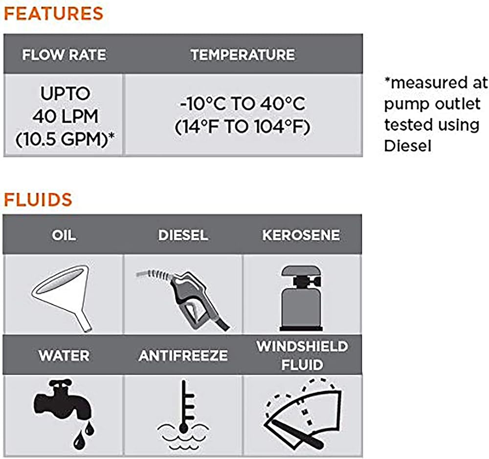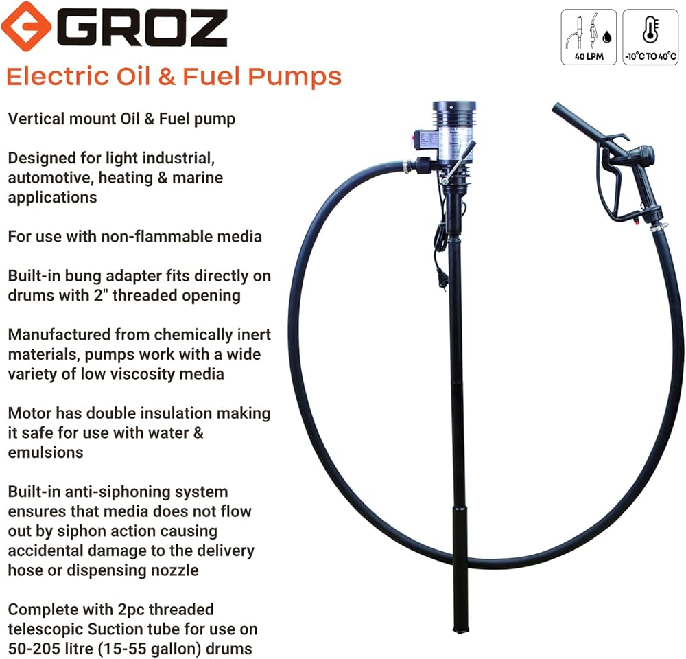 GROZ 110V Electric Oil & Diesel Drum Transfer Pump. Perfect for transferring media for light industrial, marine, heating, and automotive applications. Has 10.5 GPM (40 LPM) flow rate. Powered by 110V AC motor. With a built-in 2-inch bung adaptor for threaded openings. With double insulation to protect the user from electrical shocks. Ideal for transferring non-flammable media. Recommended for diesel, kerosene, water, antifreeze, and windshield washer fluid. Recommended for mineral oils, synthetic oils, and heating oils. Recommended for emulsions and many other viscous fluids (max 114 CST). The built-in anti-siphoning system prevents leaks or flow outs. Continuous duty cycle. Comes complete with a telescopic suction tube, polypropylene nozzle, and delivery hose.