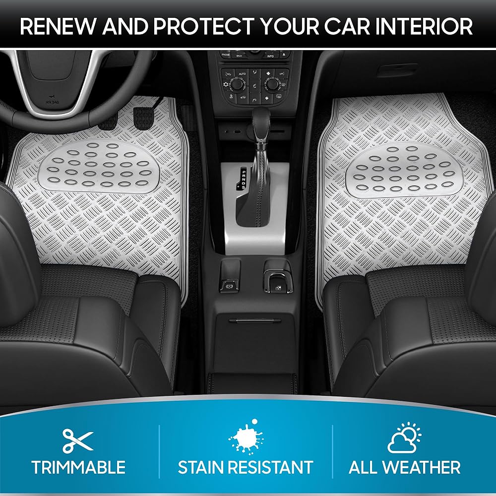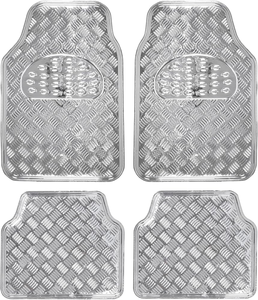 Restyle your vehicle with new metallic diamond plate mats. Durable vinyl with anti color-fade scratch resistant finish. Protects original carpet against spills, stains, mud and debris. Feature a non-skid nib backing to keep mats in place. Universal shape to fit most cars, SUVs, trucks and vans. Content: 2pc front (27 x 19 inch.) And 2pc back mats (16 x 19.5 Inch).