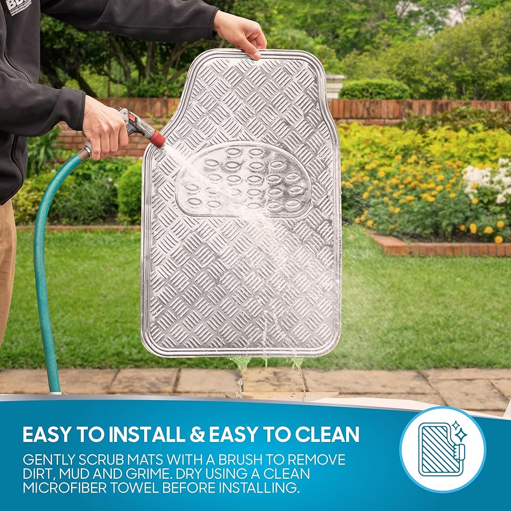 Bright metallic chrome finish floor mats, easy to wash and dry. Mats for full coverage restyle your vehicle with new metallic diamond plate mats