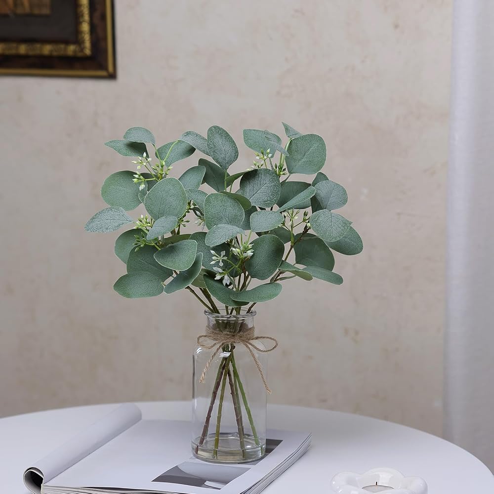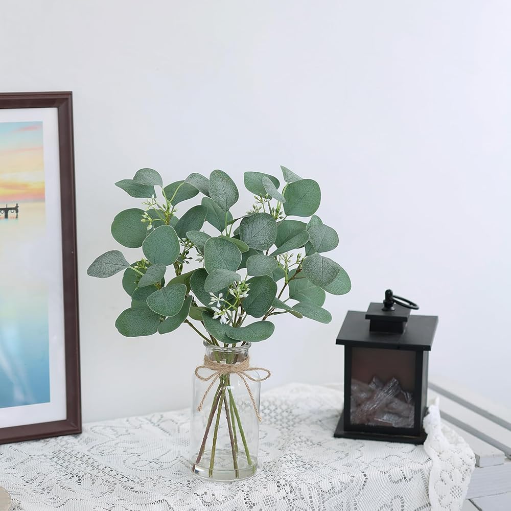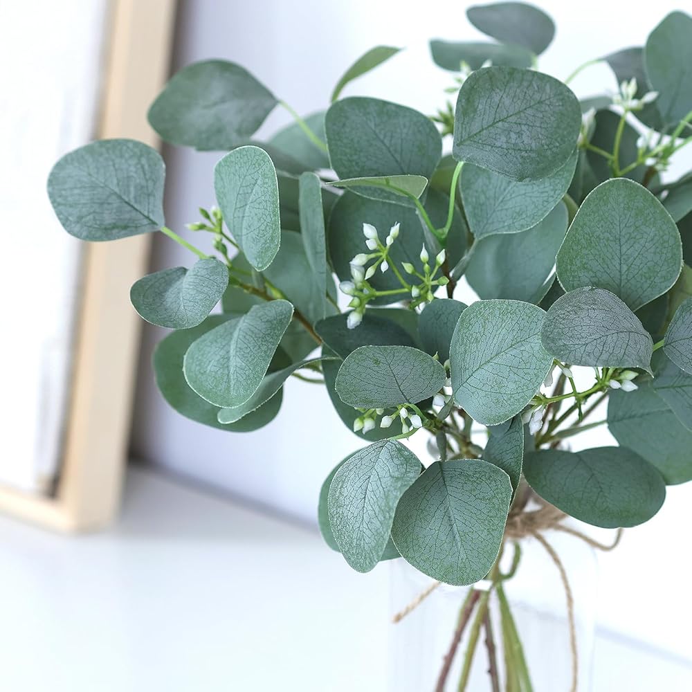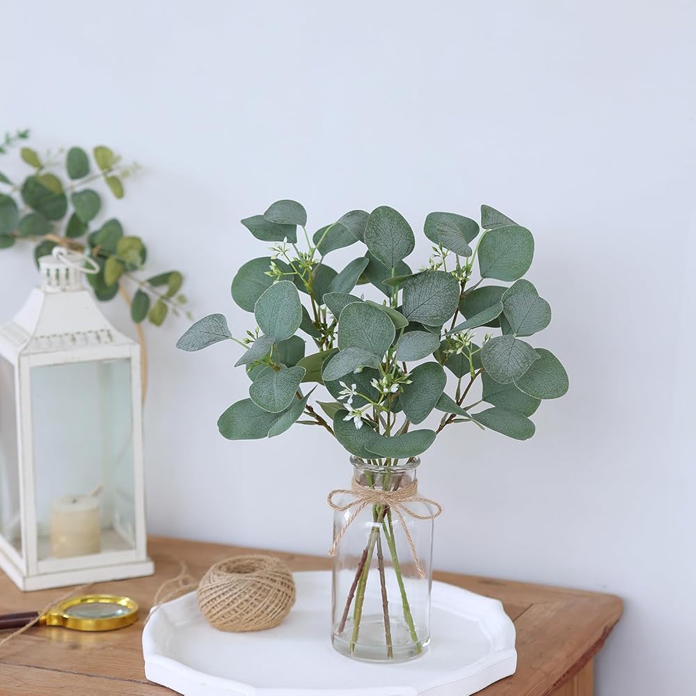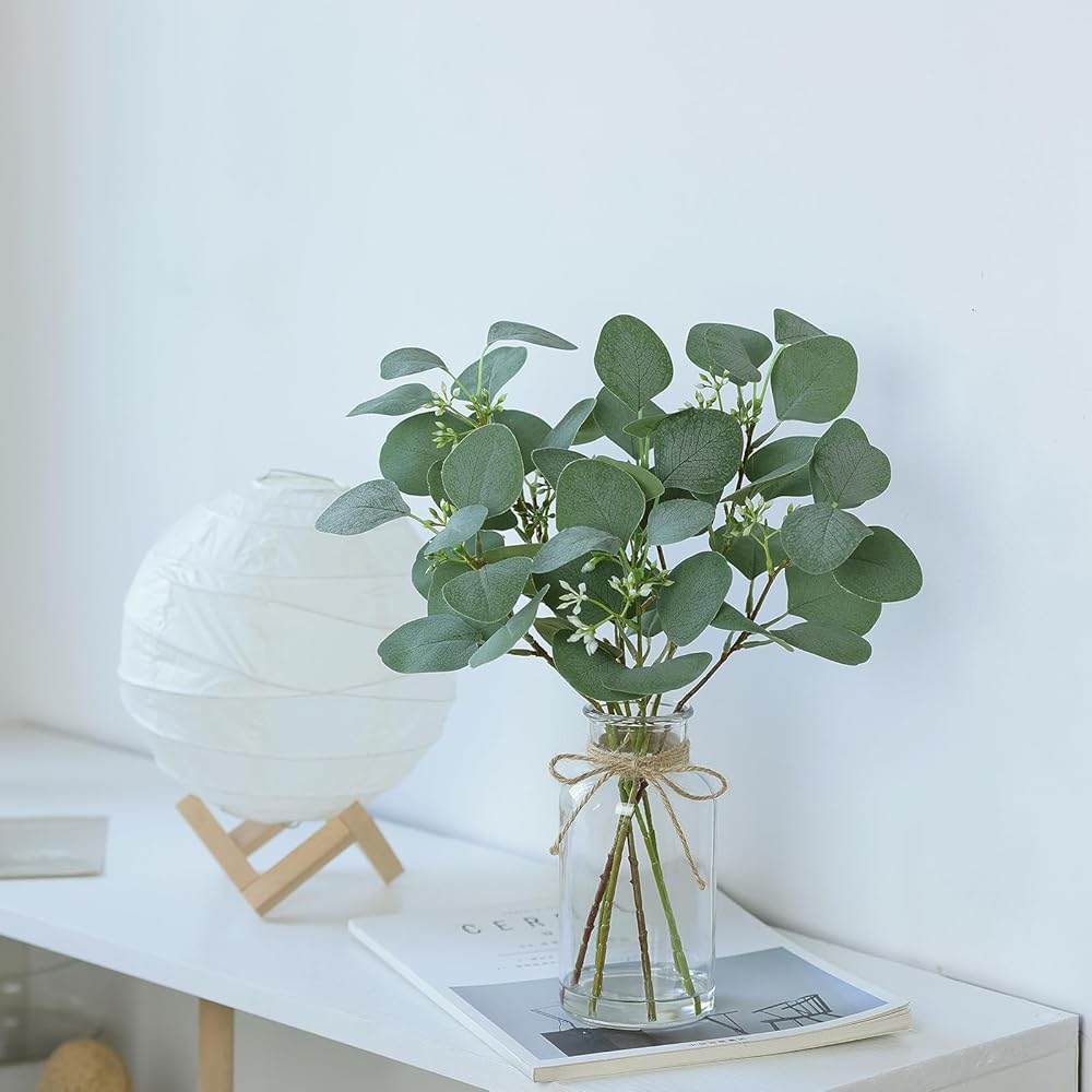 [Maintenance-free]: This Artificial eucalyptus stems with vase is a choice you can't miss! They are lush, maintenance-free, and retain their bright green shape for a long time. They don't need watering or sunlight, don't fade or wilt, and their vibrant colors come alive.