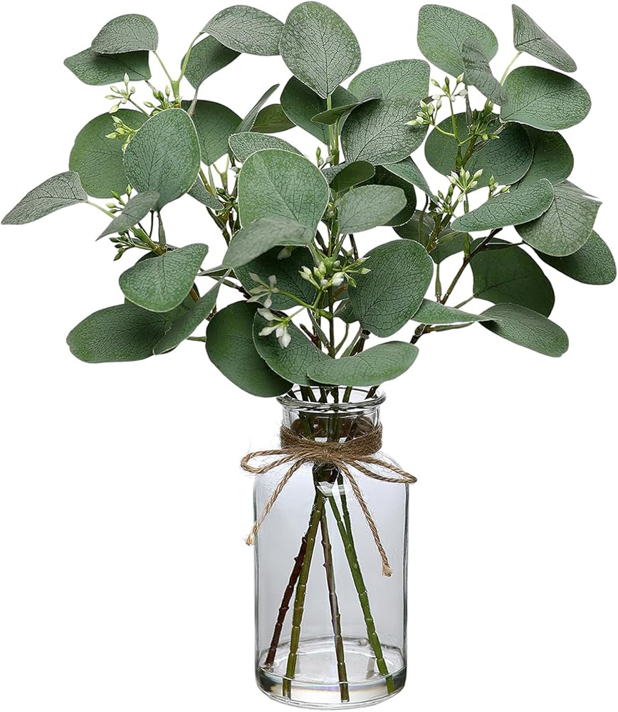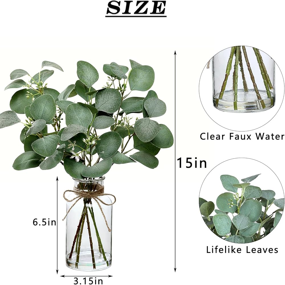 [The right size]: The total height of the artificial eucalyptus stems with the vase is about 15 inches, and the glass vase is 6.5 inches tall and 3.15 inches in diameter. Perfect size for any tabletop centerpiece.