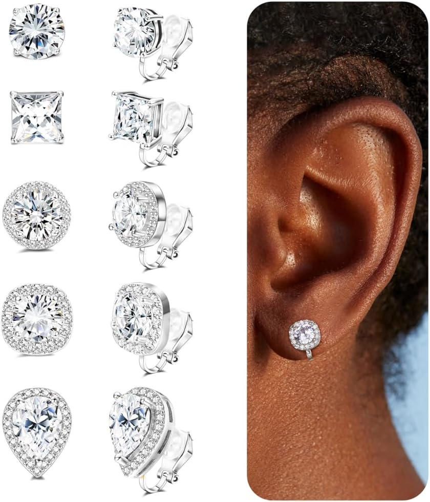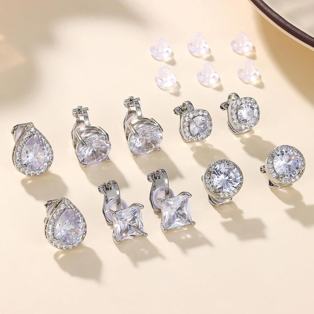 💃[CLASSIC STYLE]: One order includes 5 pairs cute cubic zirconia clip on earrings: round cz clip earrings, square cz clip earrings, round halo clip earrings, square halo clip earrings and teardrop halo clip earrings.