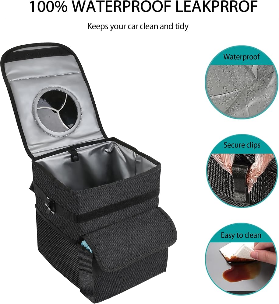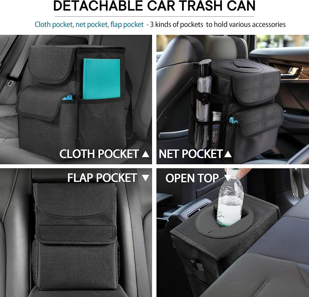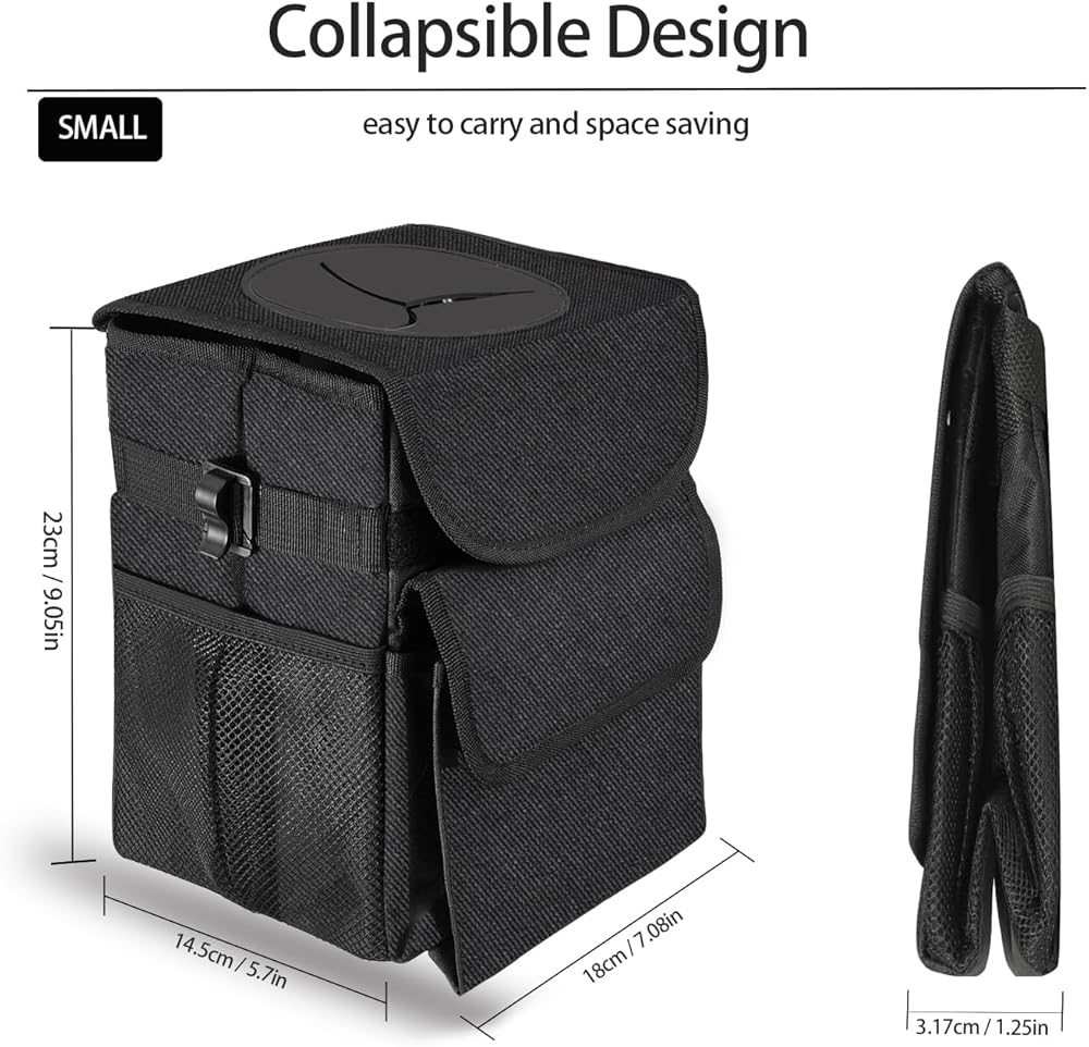 🏆🏆LARGE CAPACITY - Our car trash can have 2 sizes of 1.8/2.8Gallons to choose, the small measures 6.25*7.25*9.125 inches and the large measures 7.87*7.08*10.5'', it keep all your trash contained; one elastic mesh pocket on the side and one cloth pocket on the other side, plus one flap pocket in the front, which saves space nicely and can be folded up when not in use, very convenient.