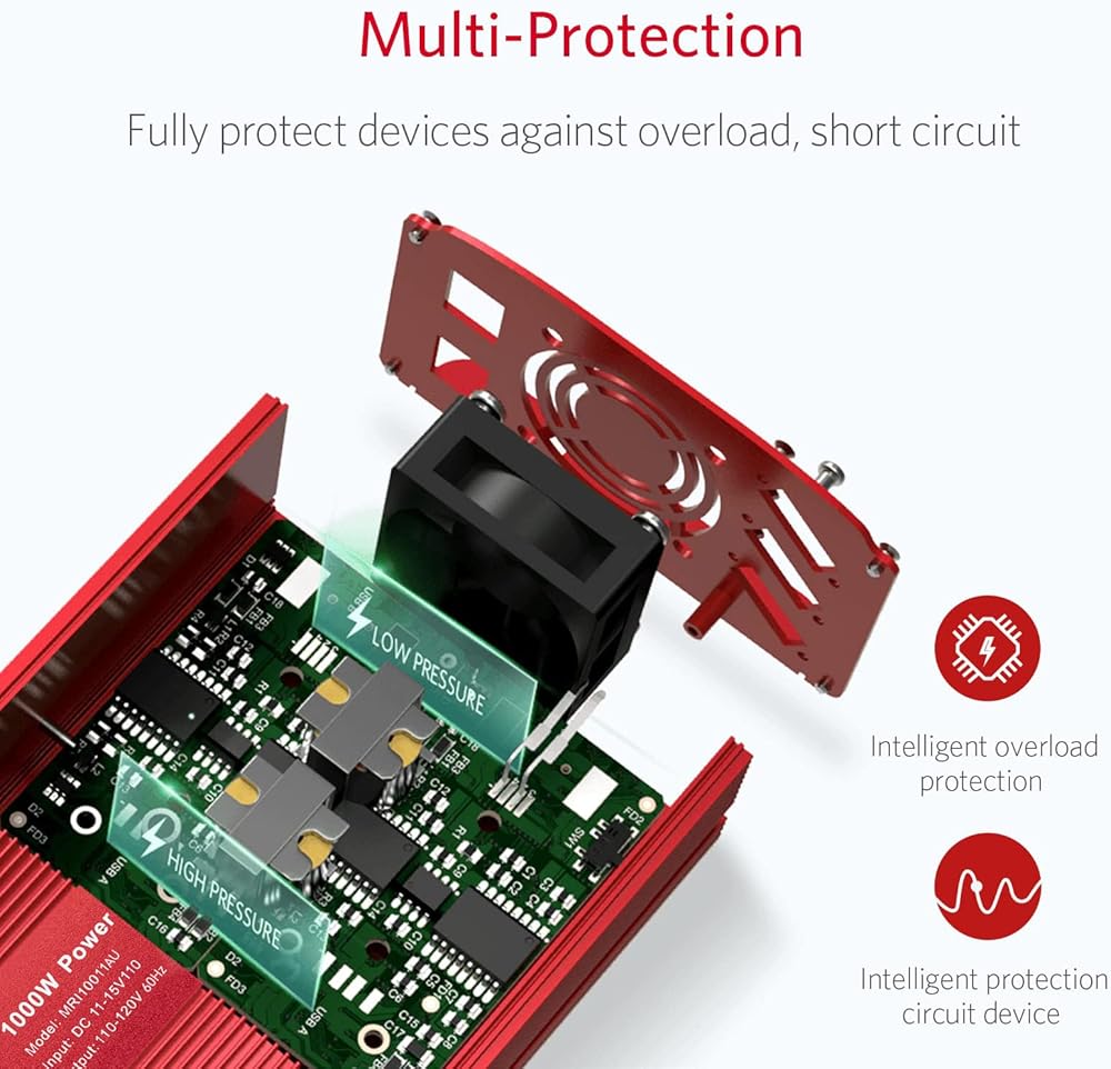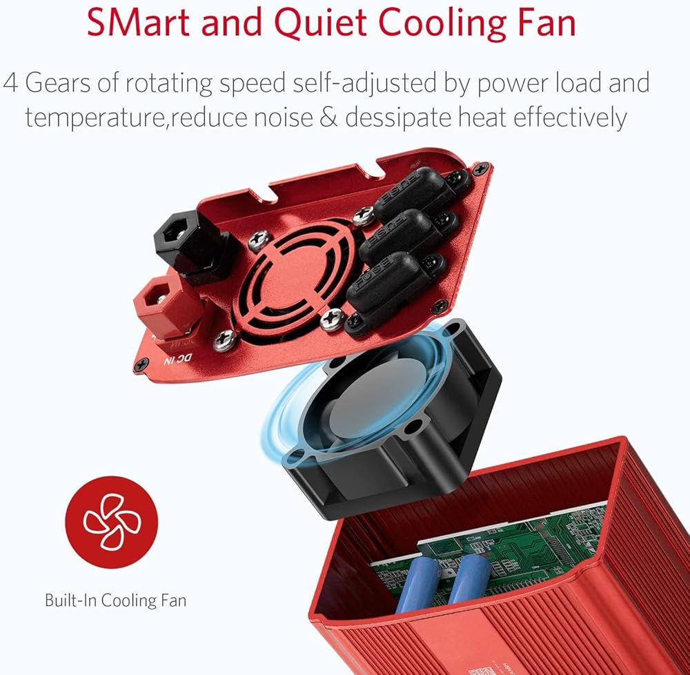 Efficient Quick Charging : Dual 110V AC outlets for powering larger devices such as laptops and tablets or any other household appliances under 1000 watts. The smart and high speed cooling fan protect the inverter against overheating.