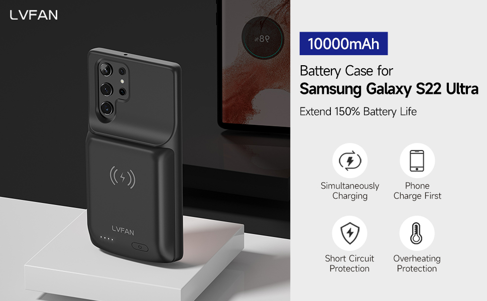 Extended 150% Battery Life: Samsung galaxy s22 Ultra battery case with built-in 10000mAh Li-polymer battery cells provide extra 150% battery life to Galaxy S22 Ultra; Keep your Galaxy S22 Ultra alive all day long. *NOTE*:ONLY FOR GALAXY S22 Ultra.