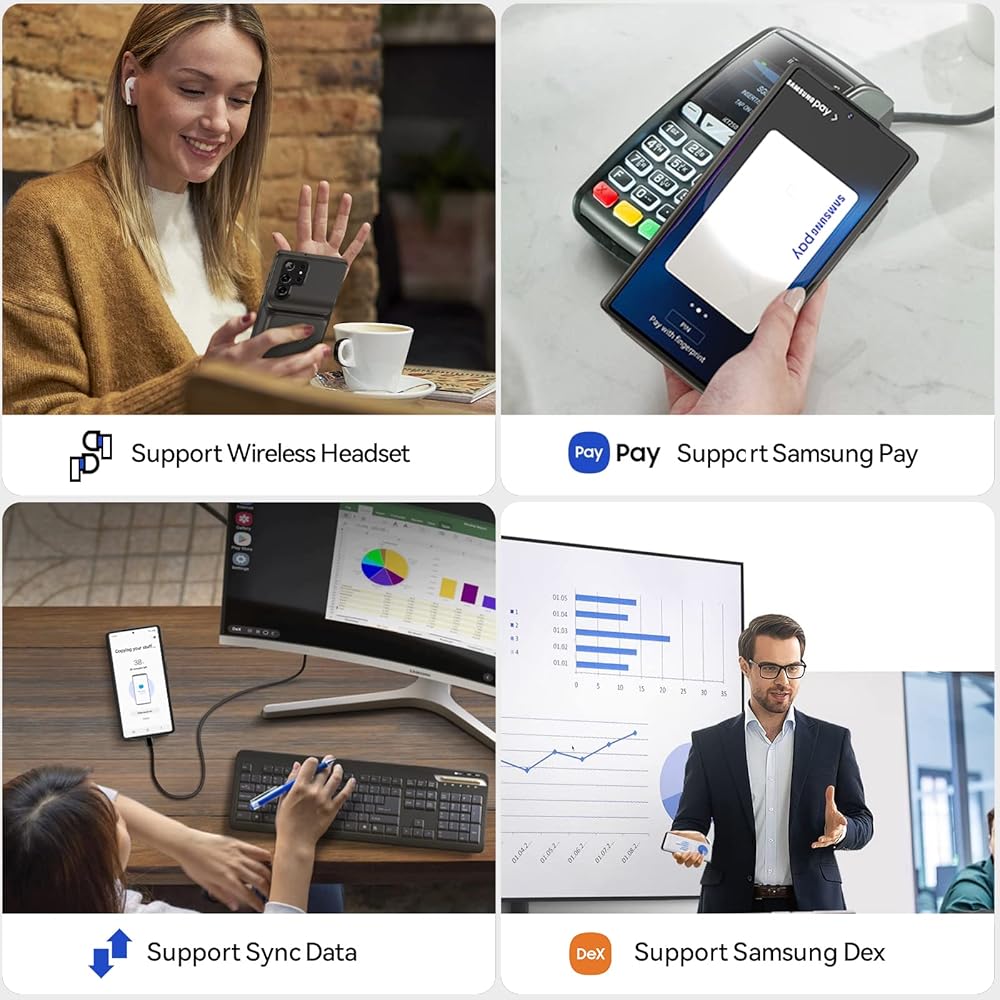 Sync Data & Samsung Dex & Android Auto & NFC Supported: Transfer data freely between Galaxy S22 Ultra and a computer through the charging case; You can enjoy the convenience of Samsung Dex, NFC and Android Auto without remove the s22 Ultra charger case.