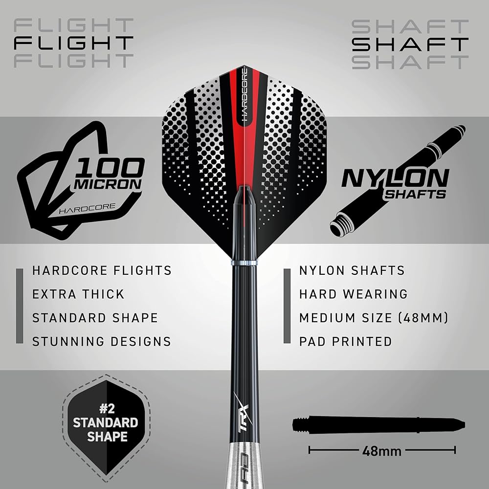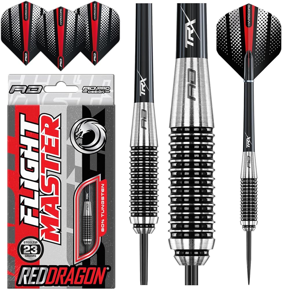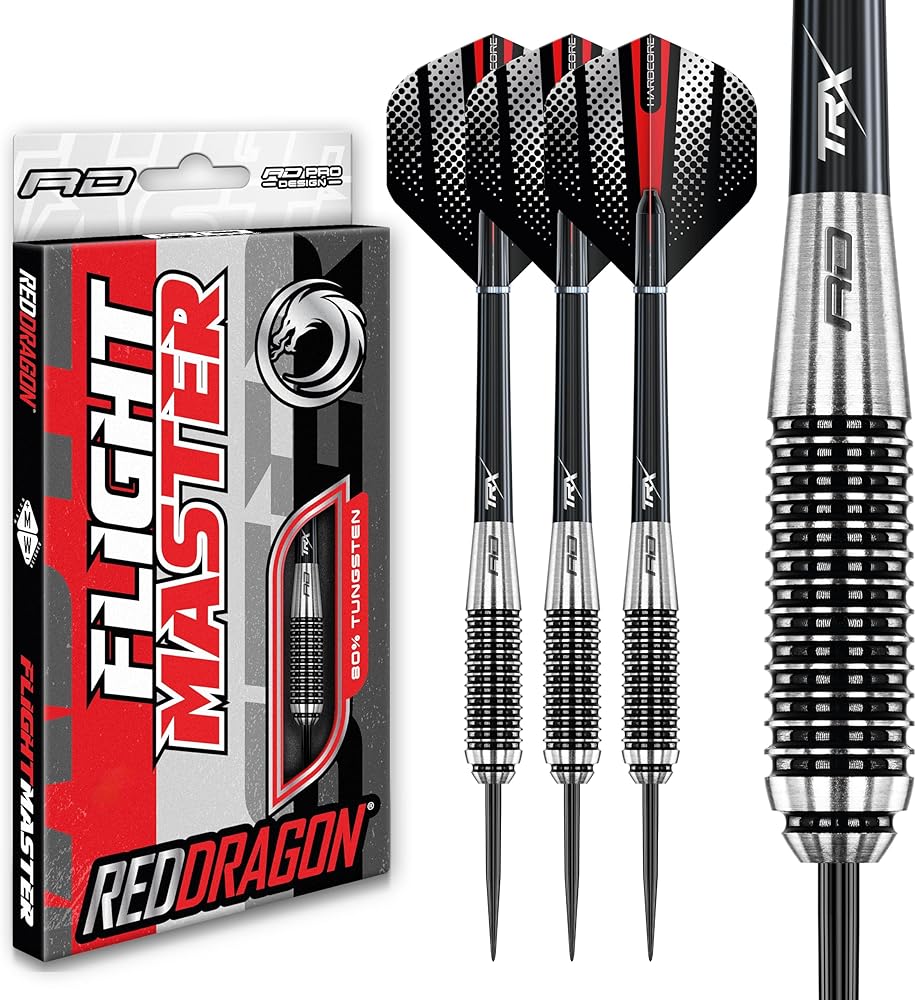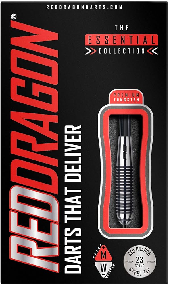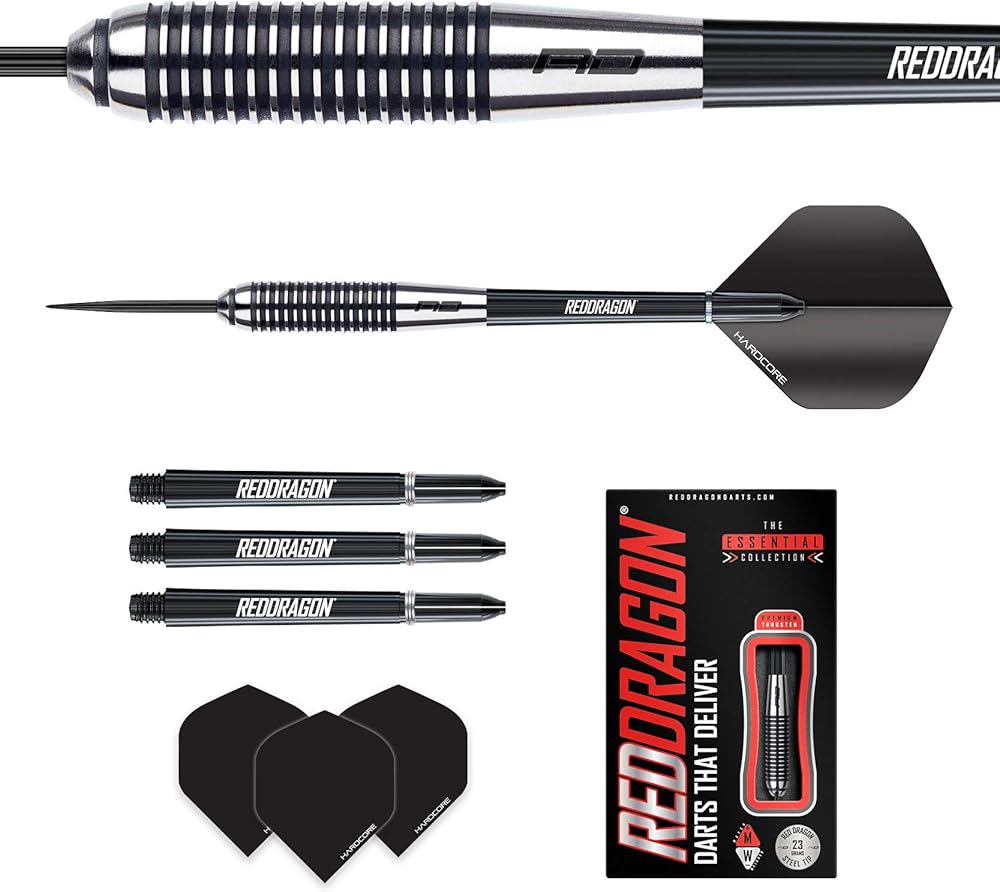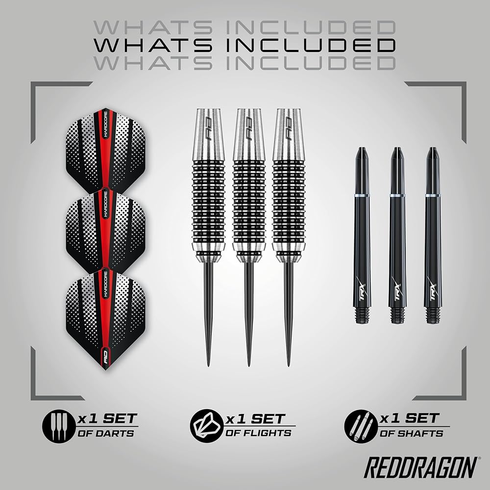 Set of 3 x premium quality Red Dragon tungsten darts set; Red Dragon black nylon ring grip stems; ; If you want to up the ante on your game, then this is the dart that can raise your score in a heartbeat; Precision Ringed Grip Darts are also available in 21g, 23g, 25g, 27g, 28g, 29g