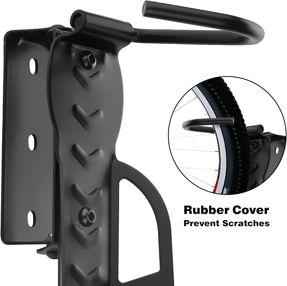 ✓【Safety】 – Wall bike rack features hook with rubber coating to protect your bicycle from scratches, and safety locking mechanism prevents accidental release.