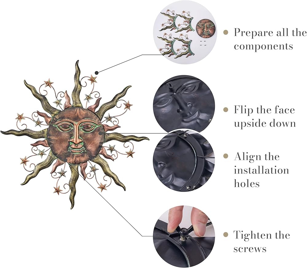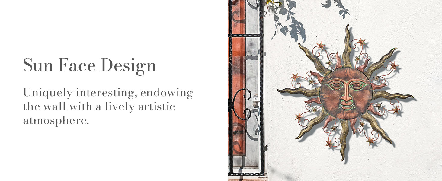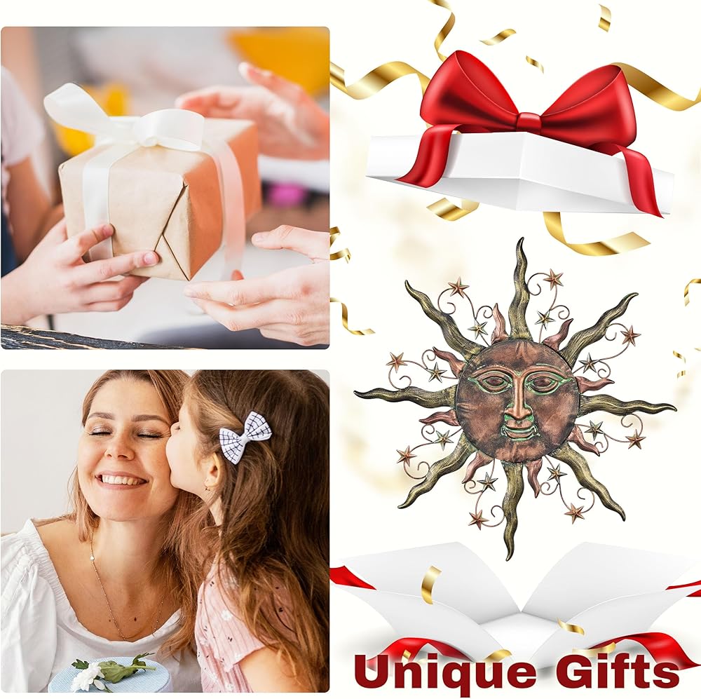 【Original Design】The metal wall art with sun face, a stunning bronze design that incorporates elements of stars and celestial bodies, creating a captivating and unique piece of wall decor.