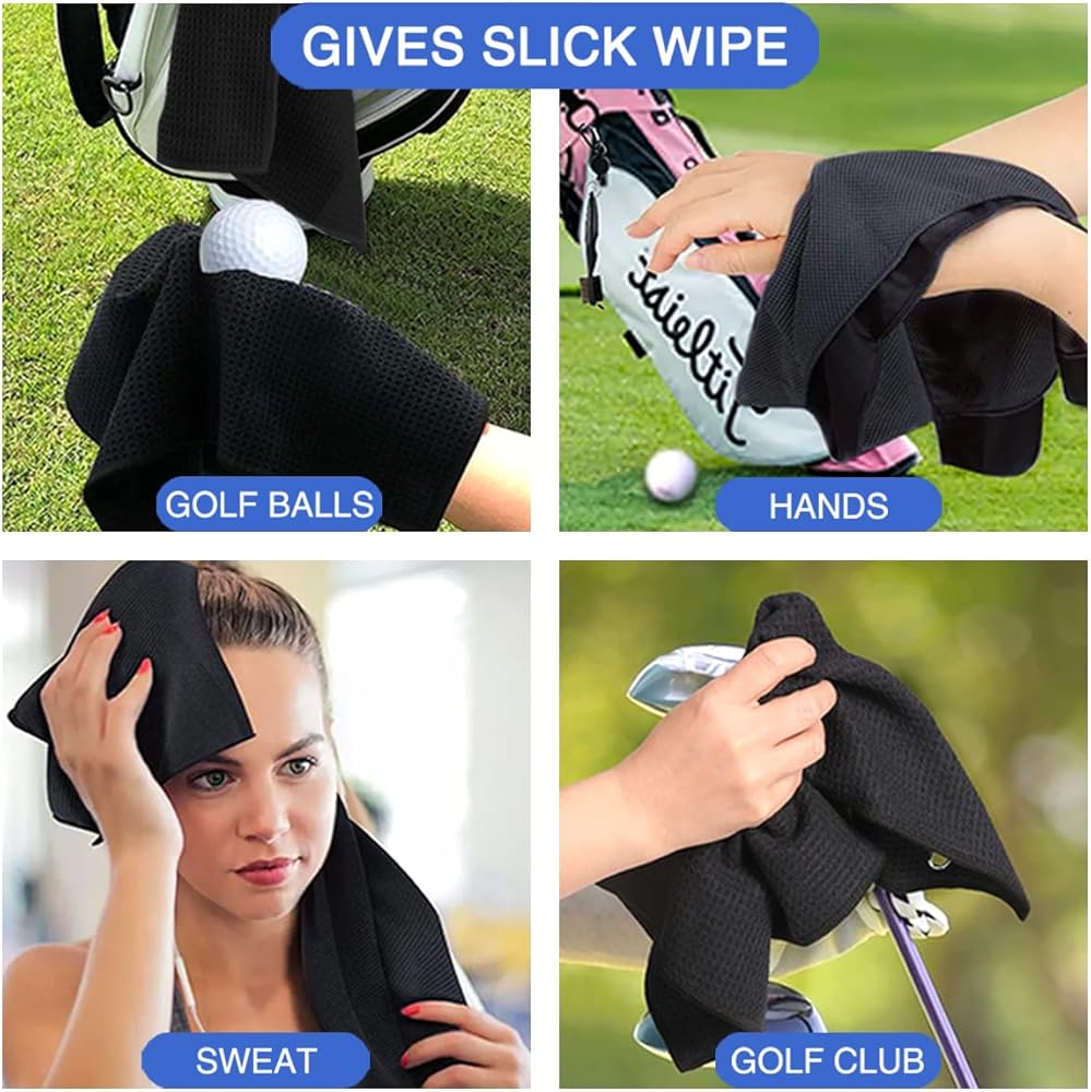 Humanized Design: Designed with a three-fold center ring and carabiner clip, the towel can be easily fixed on a golf bag, belt loop or golf cart to prevent loose clip and lost towels, it is convenient to carry and easy to use.
