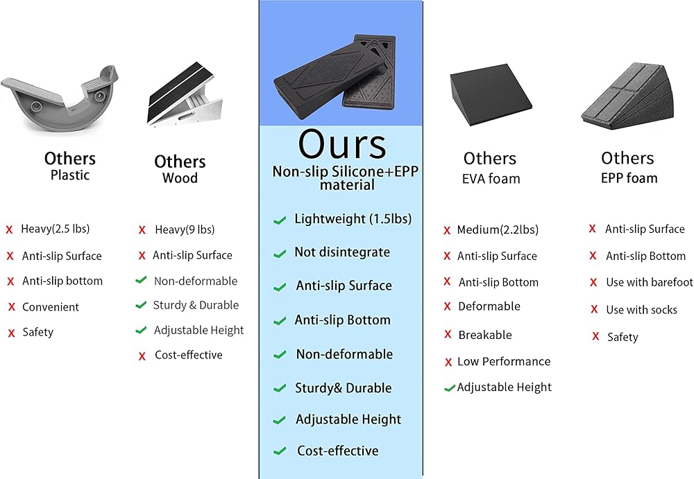 【Portable and Multi-Purpose】:Enjoy the convenience of using this non-slip squat wedge block and calf stretcher anywhere you go. It is suitable for home, gym, or office use and can be easily transported, enabling you to maintain your leg exercises and calf stretches wherever you are.