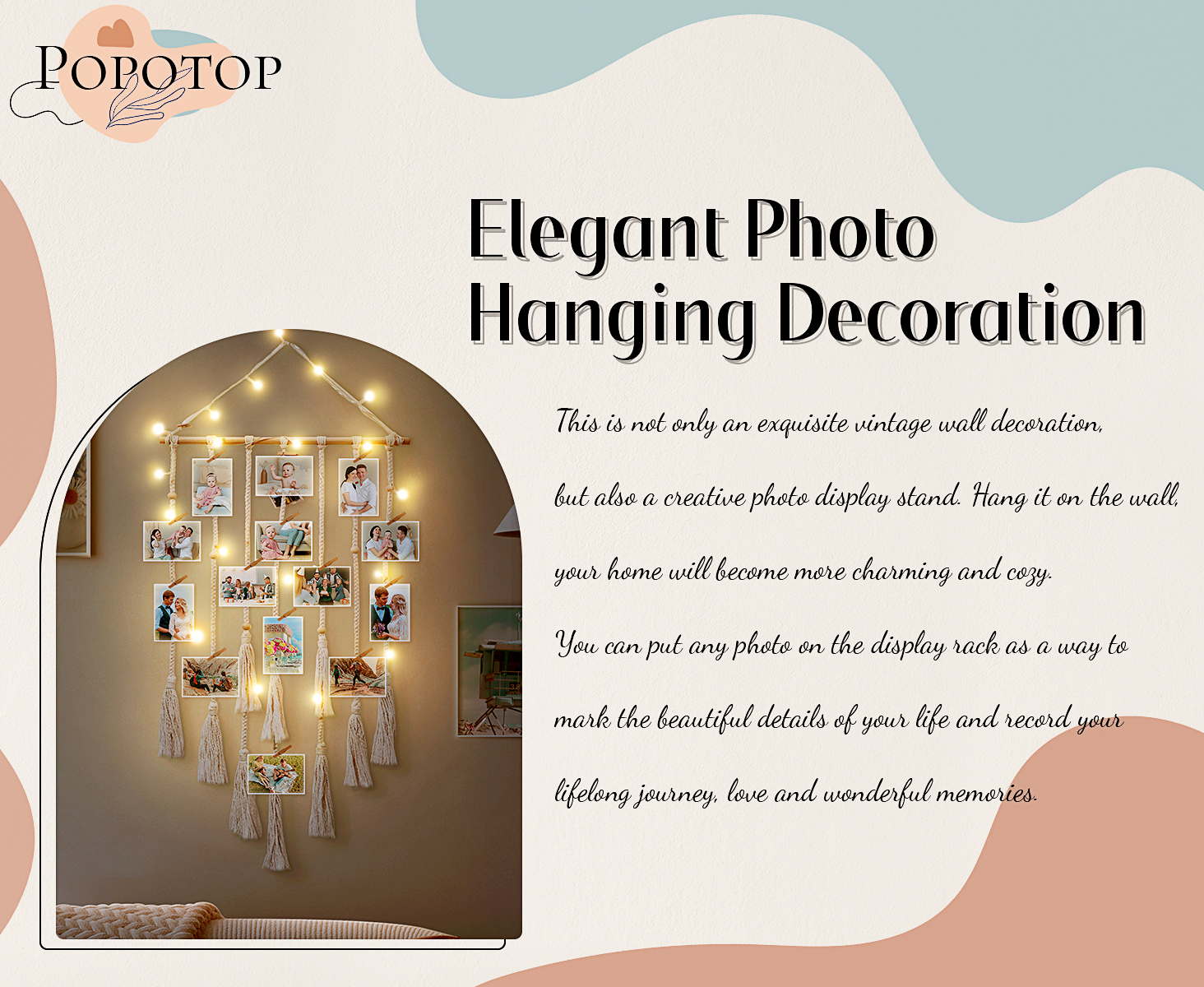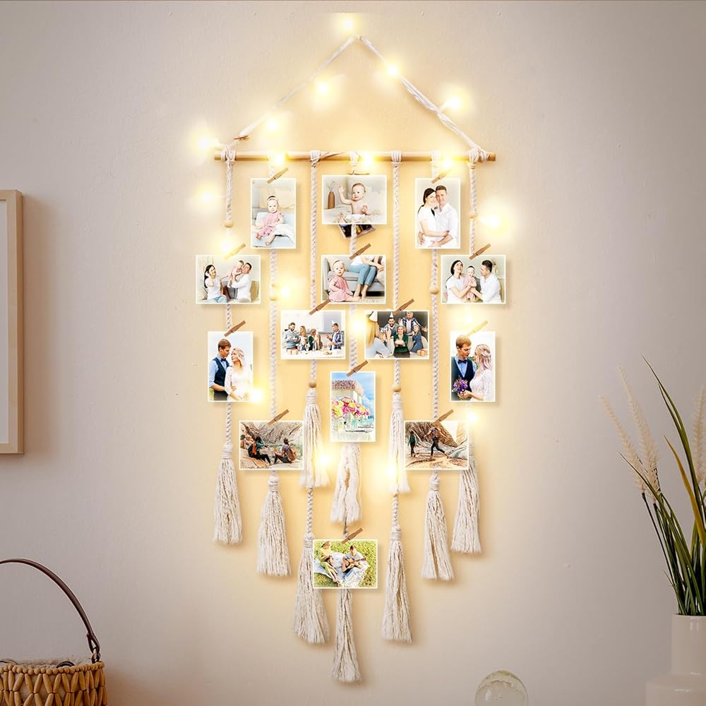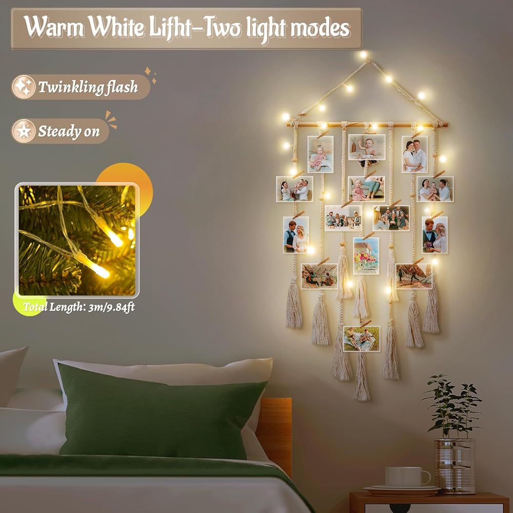 popotop Hanging Photo Display with Clip,Boho Home Wall Decor, Picture Frames Collage with LED Light String,Teenager Teen Girl Gifts Trendy Stuff,Photo Clip Holder for Children Christmas Birthday Gifts