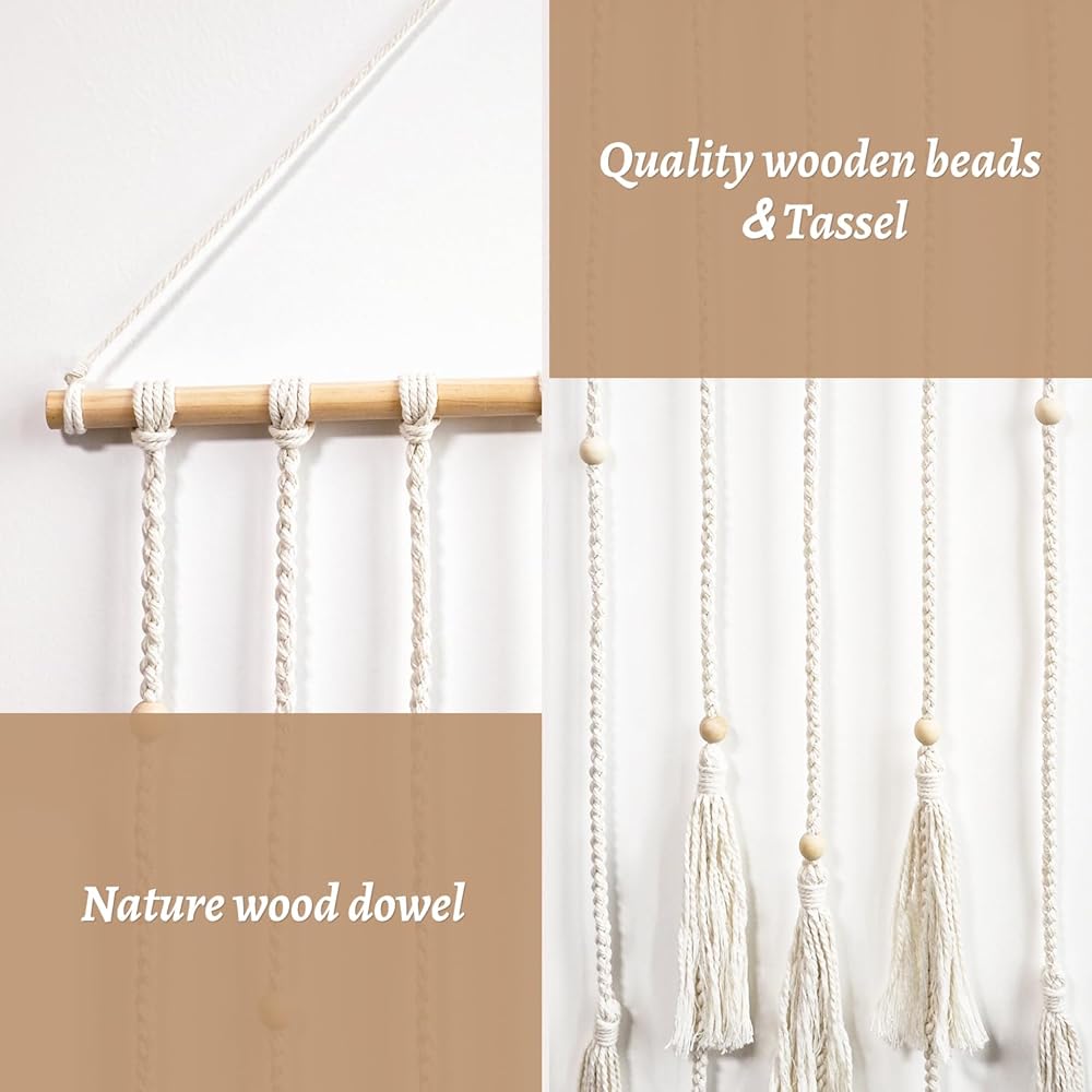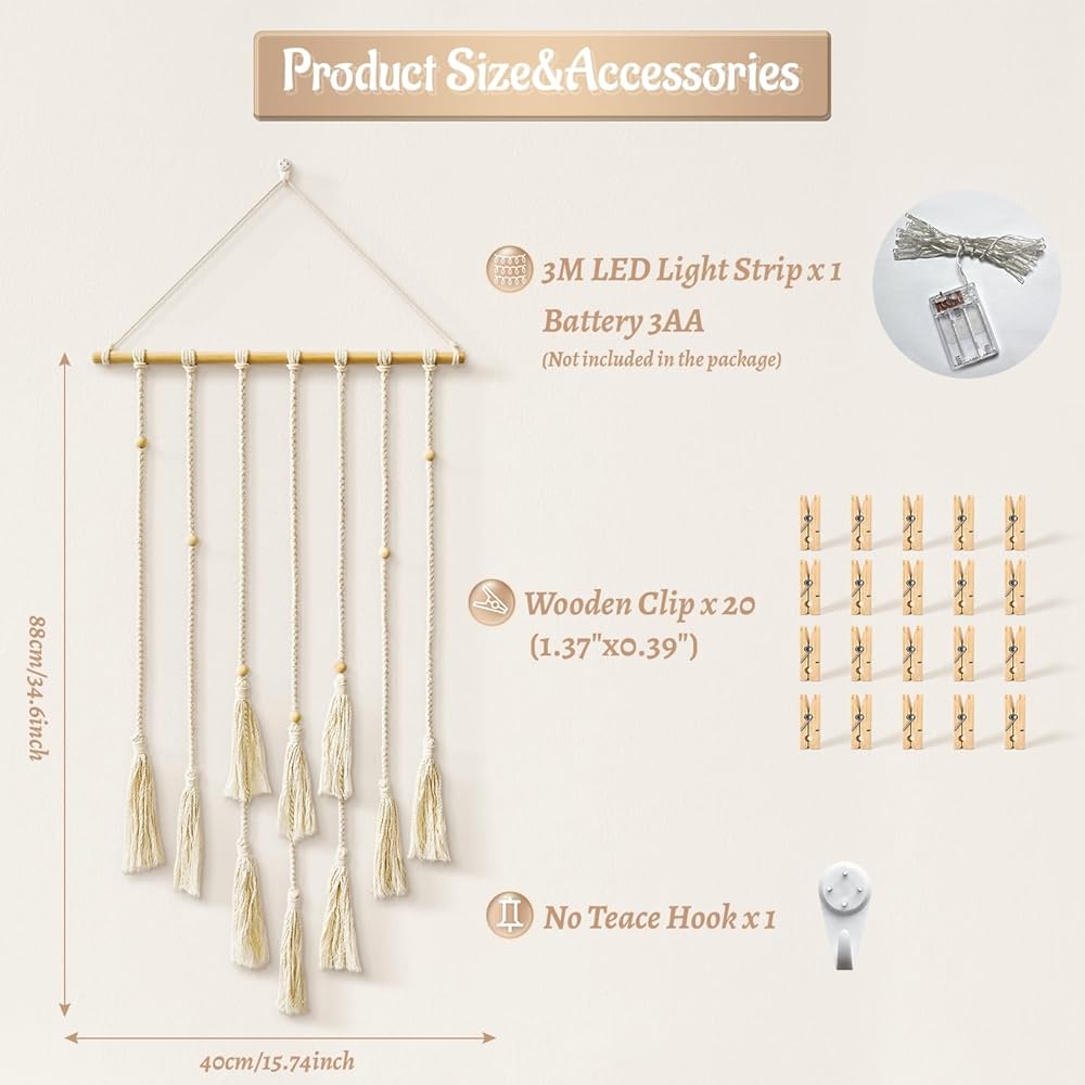 ROMANTIC WEAVING ART: Crafted meticulously from natural high-quality cotton rope and wooden pins, this wall decoration exemplifies durability through its handmade construction. Accompanied by a 9.84ft string of enchanting fairy lights with three modes, creates a warm and delightful ambiance within the room.