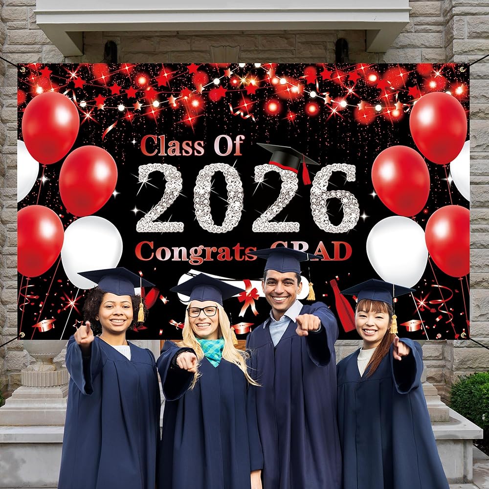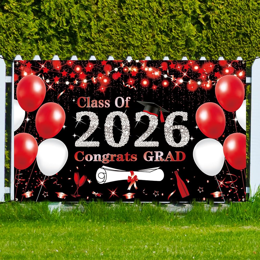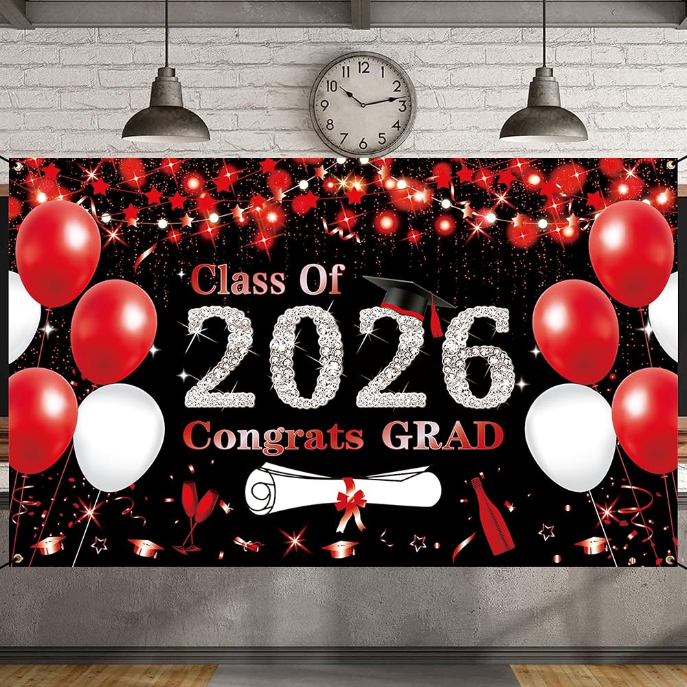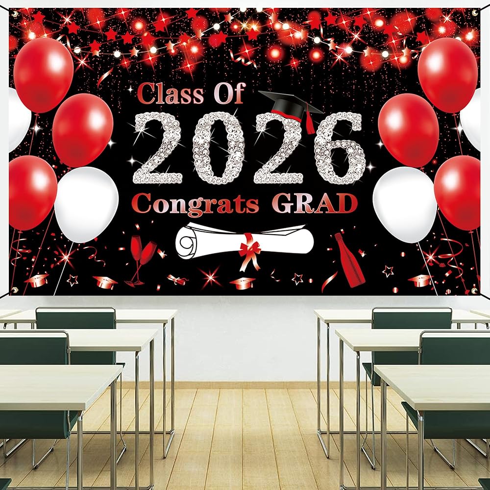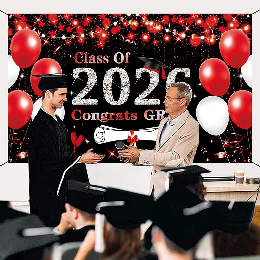 DARUNAXY Black Red Graduation Party Decorations, Red 6x3.6ft Red Class of 2026 Graduation Banner for Men Women 2026 Congrats Grad Party Supplies Masters Congratulations Graduates Backdrop Grad