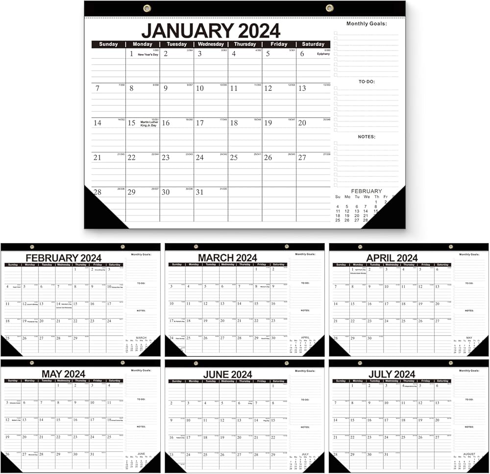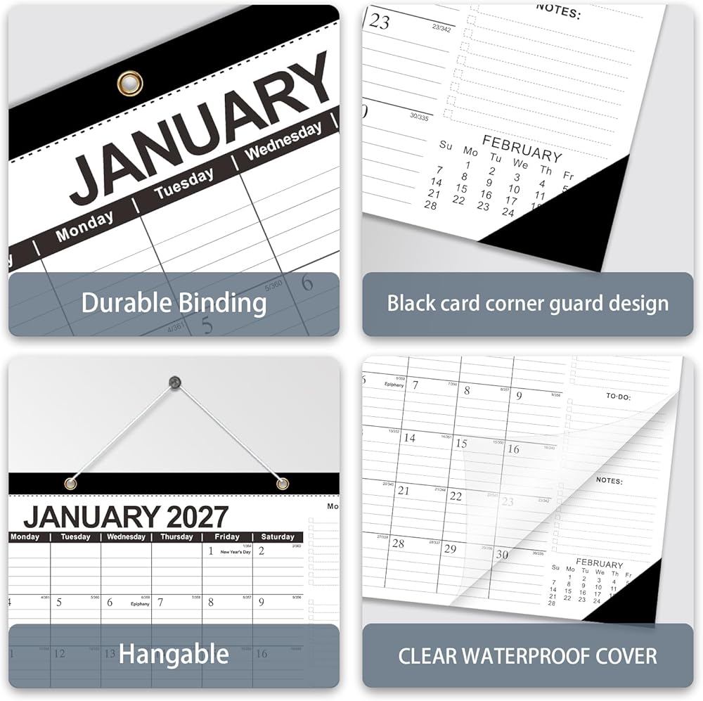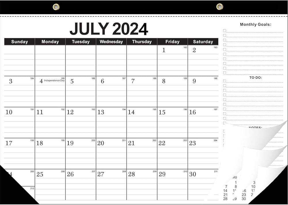 Kyweel desk calendar has 18 months, the pages are perforated for easy tearing off. The top is perforated for easy hanging; the bottom has two black corners to keep the page flat when hanging or laying on a tabletop.