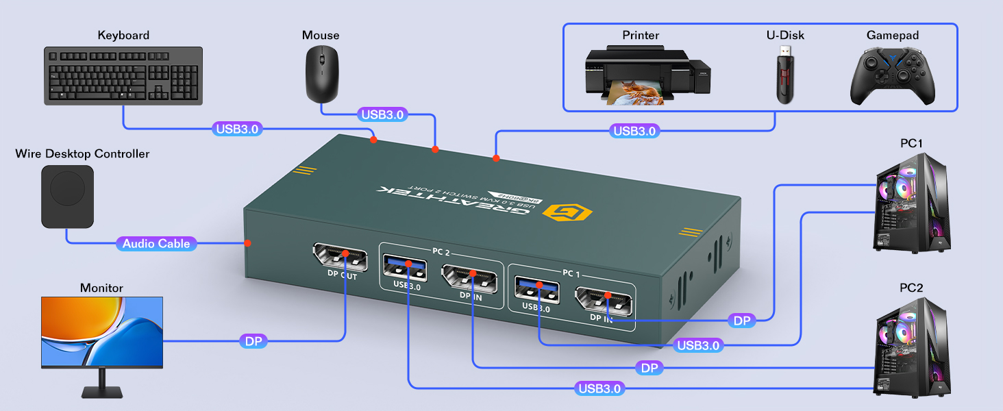 [𝟐 𝐏𝐂 𝟏 𝐌𝐨𝐧𝐢𝐭𝐨𝐫 𝐊𝐕𝐌 𝐒𝐰𝐢𝐭𝐜𝐡]This 2 port dp monitor switch can let you control two computers with just one set of keyboard and mouse, and displayed on a monitor,avoiding you swapping the USB can HDMI cable between the 2 PC back and forth ,saving your time, time is money!
