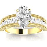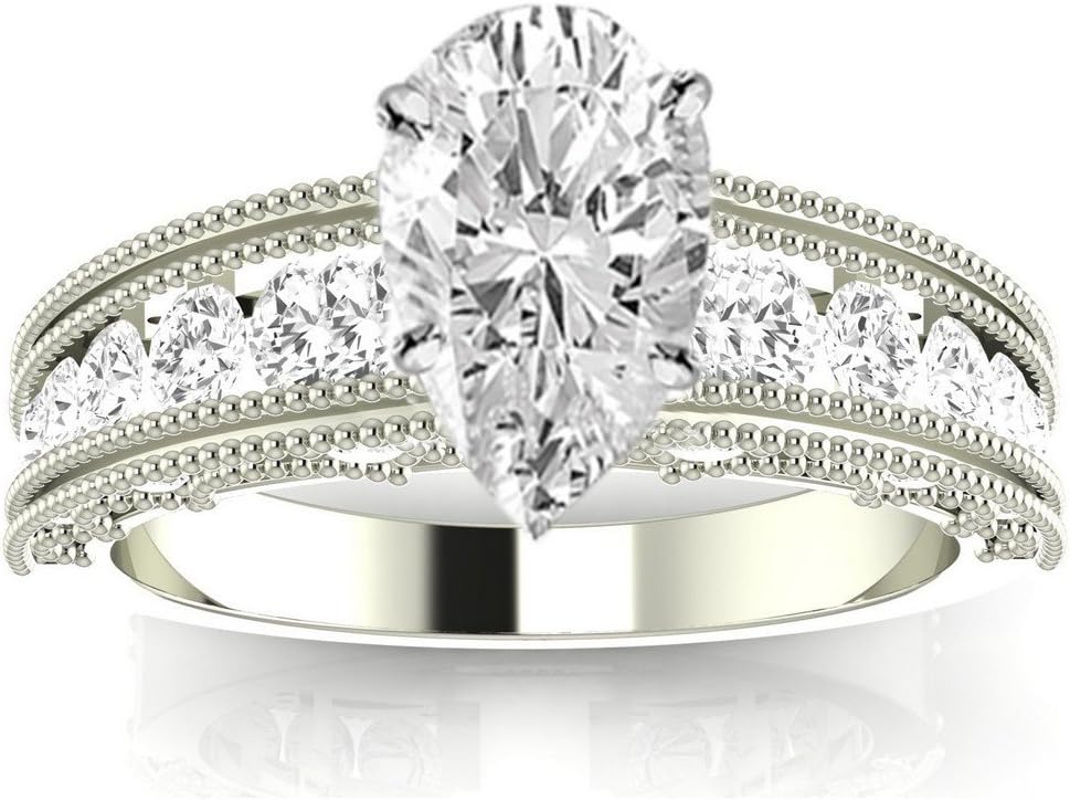 14K White Gold 3 Carat LAB GROWN IGI CERTIFIED DIAMOND Antique / Vintage Style Channel Set Round Pear Cut Diamond Engagement Ring with Milgrain (H-I Color VS1-VS2 Clarity 2.5 Ct Center)