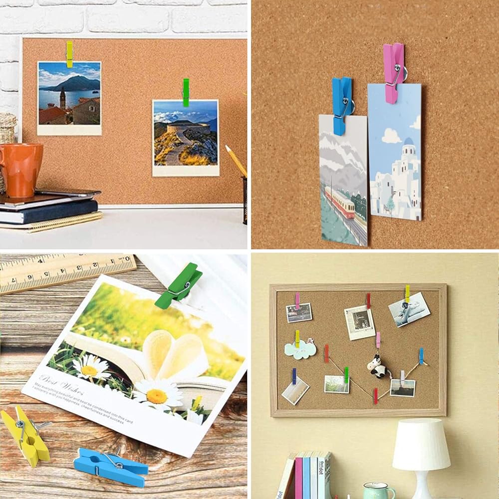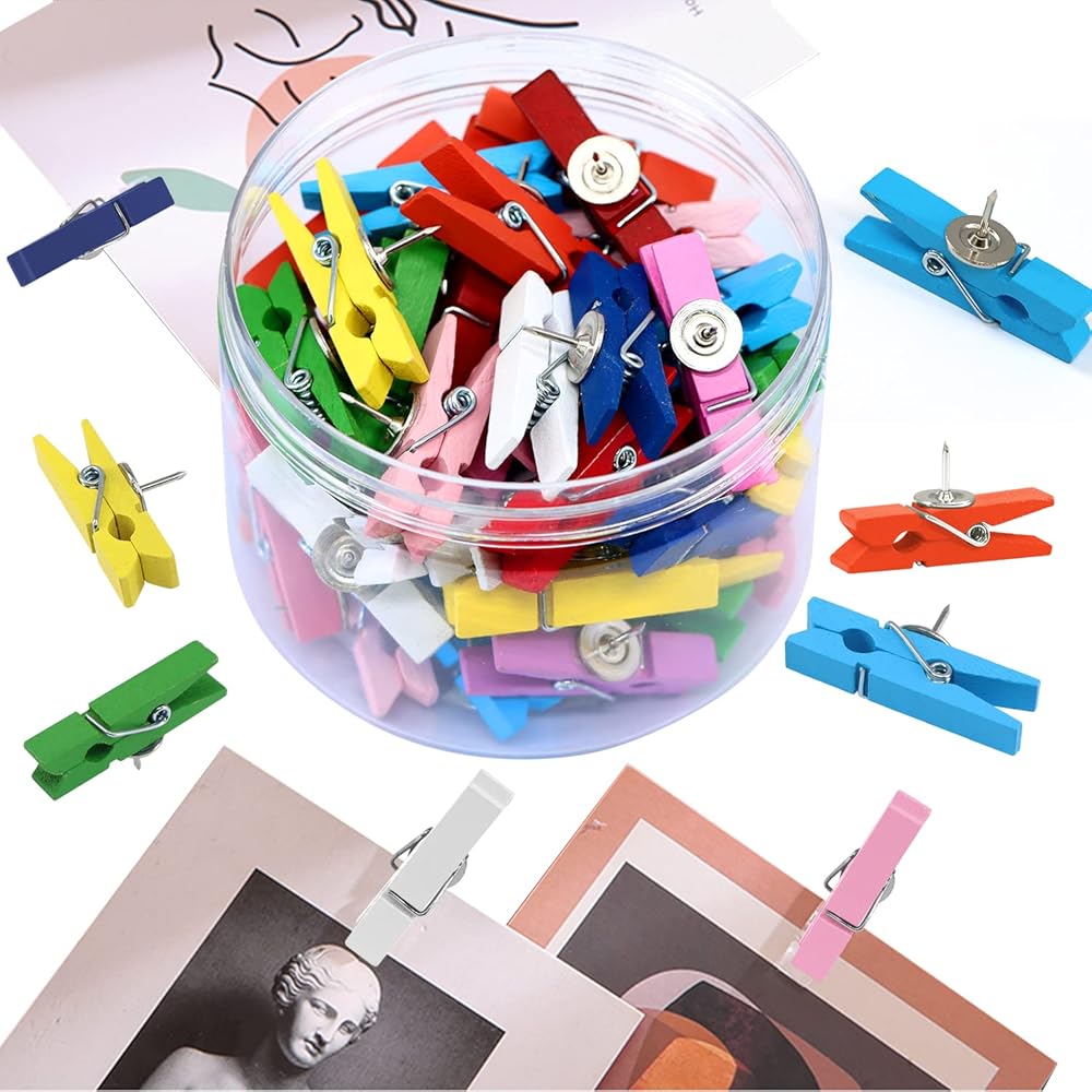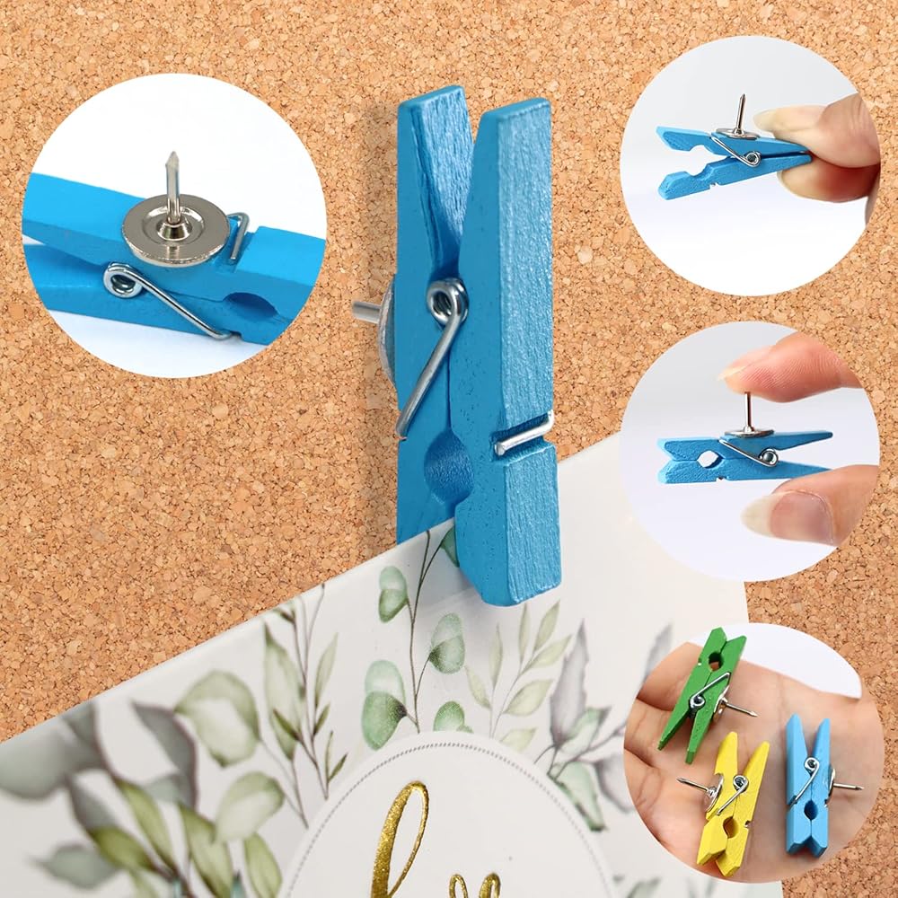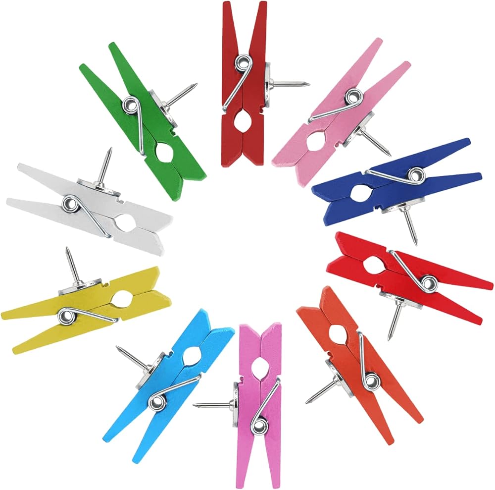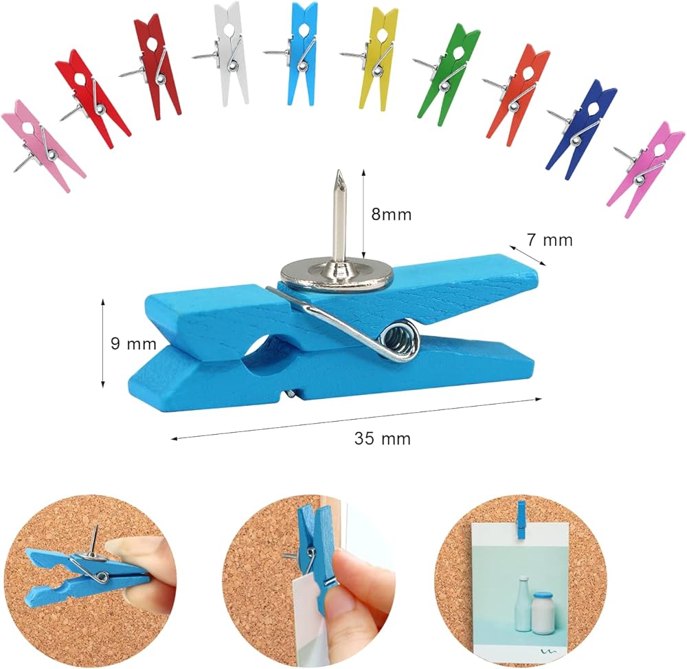 Wide Application: AnutriON Colorful push pins with wooden clips are great for hanging photos, paper, artwork, ticket stubs, home decor, sticky notes and notes on cork boards. Ideal for school, office, home, meeting, cork board, a perfect accessory for the bulletin board..