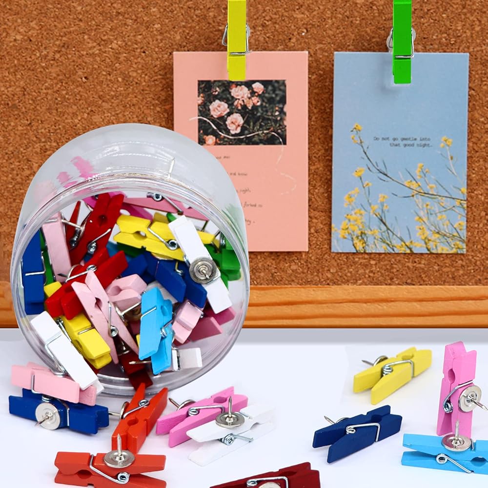 Colorful Push Pin Set: AnutriON 50 pcs colorful push pins with wooden clips in assorted colors. These push pins for cork boards are affordable and enough for bulletin board decorations, classroom, office and home use.