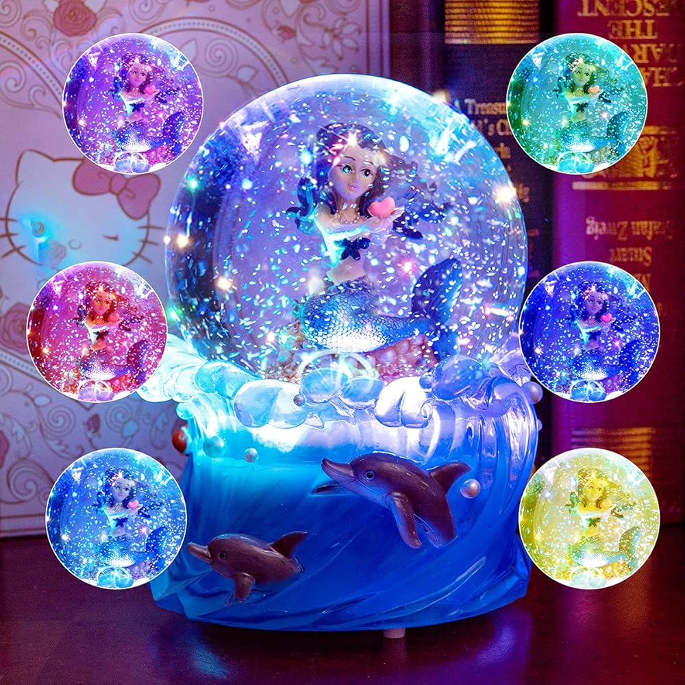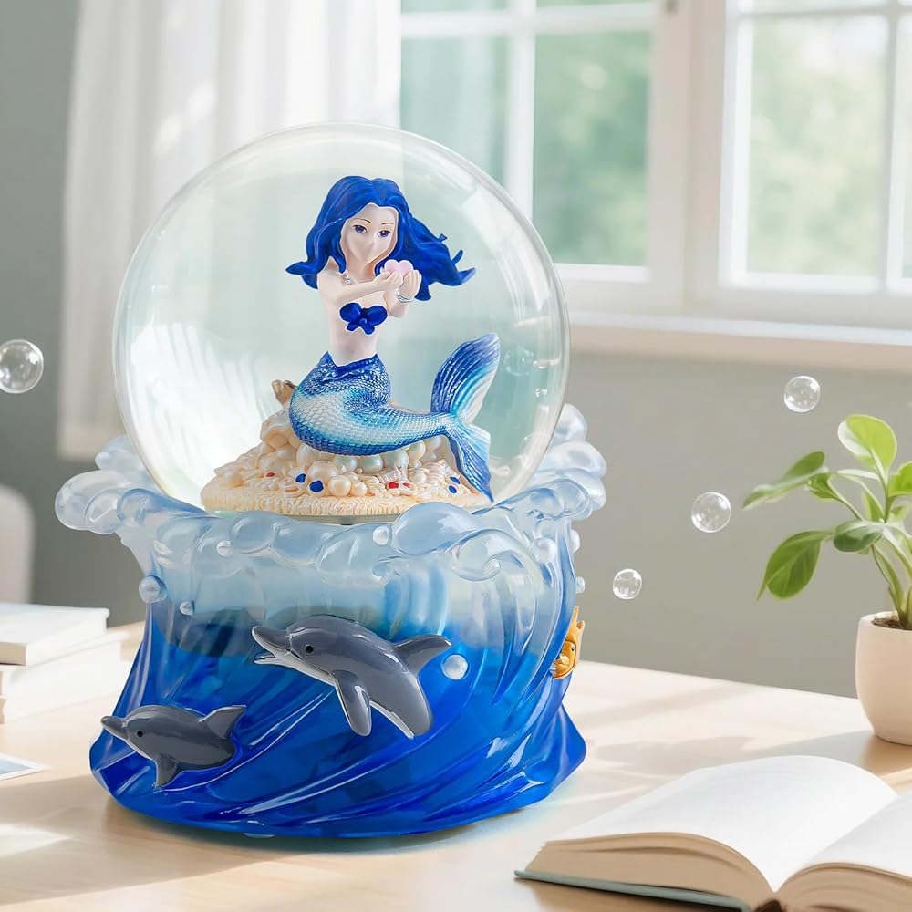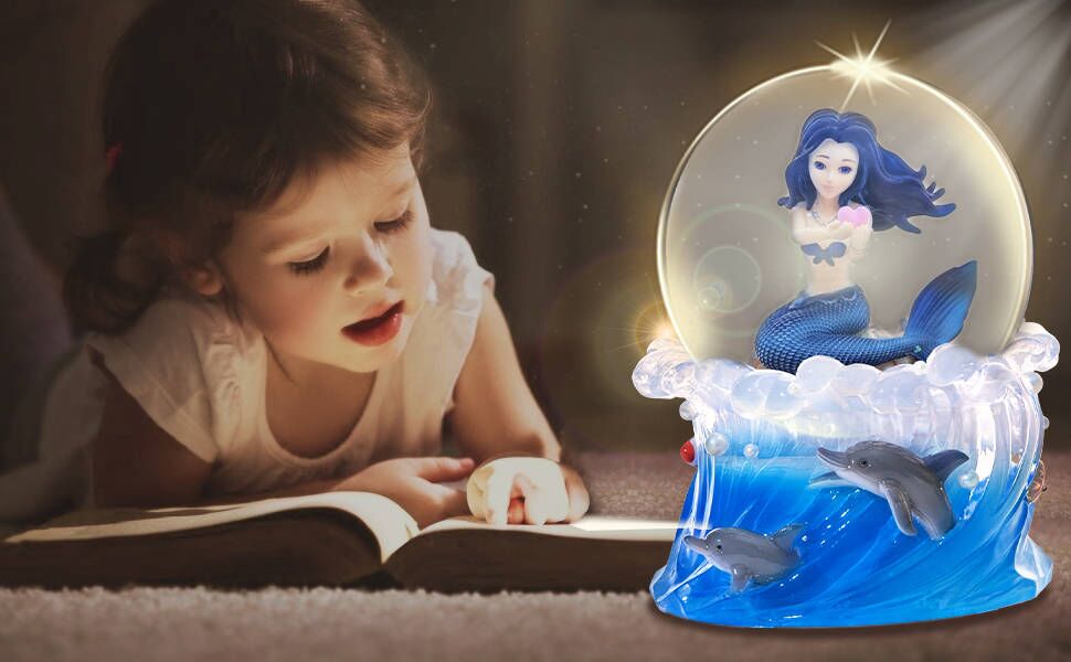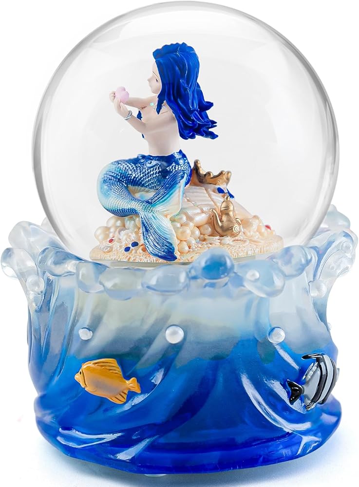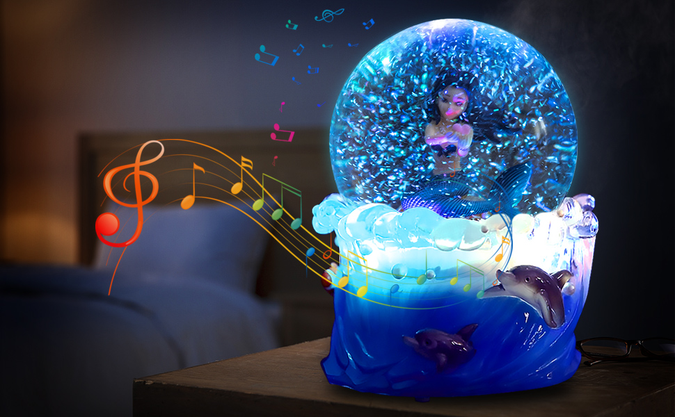 MERMAID MUSIC BOX GIFT: This is a cute little mermaid snow globe with mucic and light, the mermaid sit on the shell and armed with heart. Below the ball are engraved sea wave, fish and dolphin.it is beautiful.