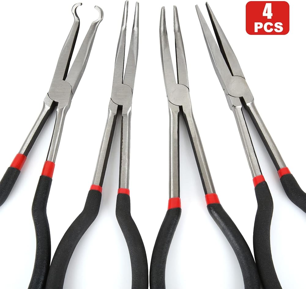 4 in 1 Long Needle Nose Pliers Set, Bent Needle Nose Pliers 90 Degree 45 Degree, Spark Plug Wire Removal Tool, Pointy Nose Pliers, Pinch Nose Pliers, Snipe Nose Pliers, Curved Nose Pliers