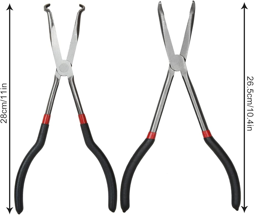 4 in 1 Pointy Nose Pliers Set: Each set includes 1x needle nose plier; 1x bent needle nose plier 90 degrees; 1x bent needle nose plier 45 degrees; 1x spark plug plier, 11 inches length