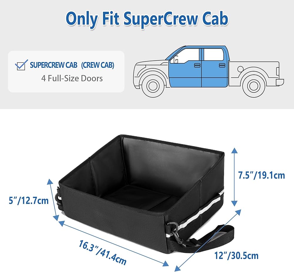 UNIVERSAL FITS: Length: 16.3”, Width:12”, Height: 5”-7.5”. The under truck seat storage is suitable for Super Crew Cab or Crew Cab (4 full-size doors). The design is perfect fit the under car seat. Please measure the space under the rear seat before purchasing.