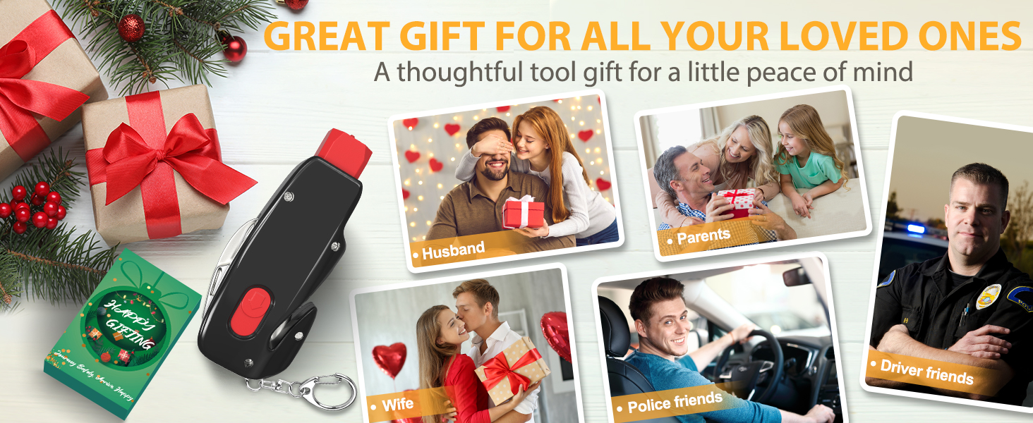 [6 IN 1 Multifunction Car Escape Tool] - CAREVER Spring-Loaded Punch window breaker keychain includes a Window Breaker, Seatbelt Cutter, Airbag Needle Punch, Screwdriver with Tread, Depth Gauge for Car Tires, Static Eliminator, and Pocket Knife. In an accident or other emergency, The seatbelt cutter will quickly cut through seatbelts; A glass breaker can quickly and effectively break car windows. The car safety hammer is a great gift for drivers, passengers, and outdoor enthusiasts