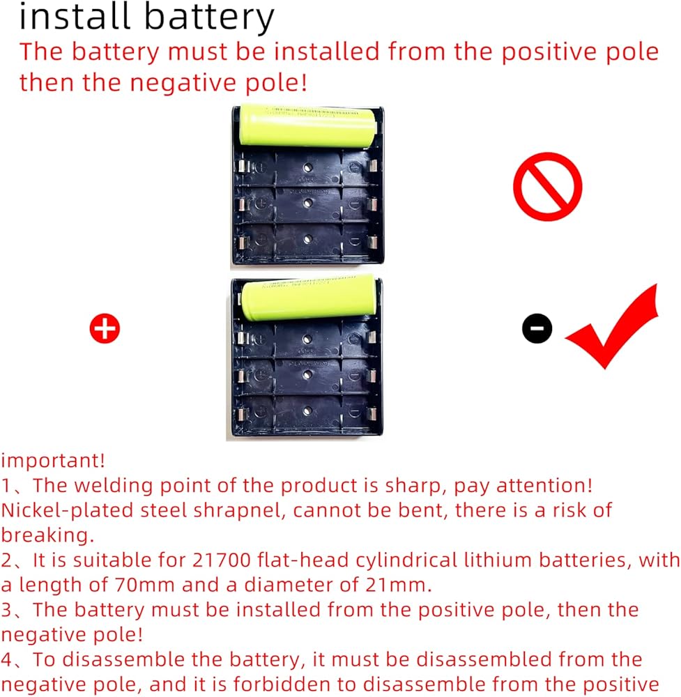 Warm Tips:Batteries are not included. It's best to use a consumer 21700 battery with a button cap.The battery holder is nickel-plated. Please avoid using it under high temperature conditions and do not bend the pins.The battery must be installed with the positive pole first, and then the negative pole! To remove the battery, you must remove it from the negative pole, and it is forbidden to remove it from the positive pole of the battery! Otherwise, there is a risk of short circuit!