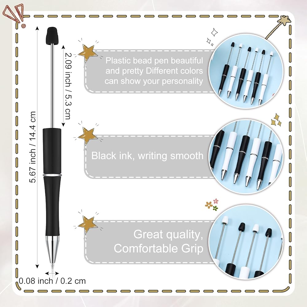 DIY Bead Pens: the middle rod of beaded pen is about 2.09 inches/ 5.3 cm in length and 0.08 inches/ 0.2 cm in diameter, which is suitable for most bead holes, attractive and interesting to use; You can add some charming beads and use your imagination to DIY these ballpoint pens to show your personality